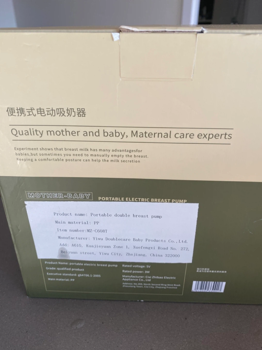 Giving away a Mother-Baby portable double electric breast pump! The box says it's designed for new moms and focuses on quality for both mother and baby. The main material is PP, and it's rated at 5V and 3W.