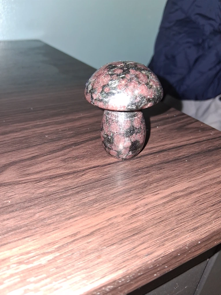 Here's a cute Rhodonite or Eudialyte mushroom decor piece! Sorry I cannot remember what crystal it is and my identification app is giving me both Rhodonite and Eudialyte as possibilities. It's a lovely addition to any collection or space, bringing a touch of nature indoors