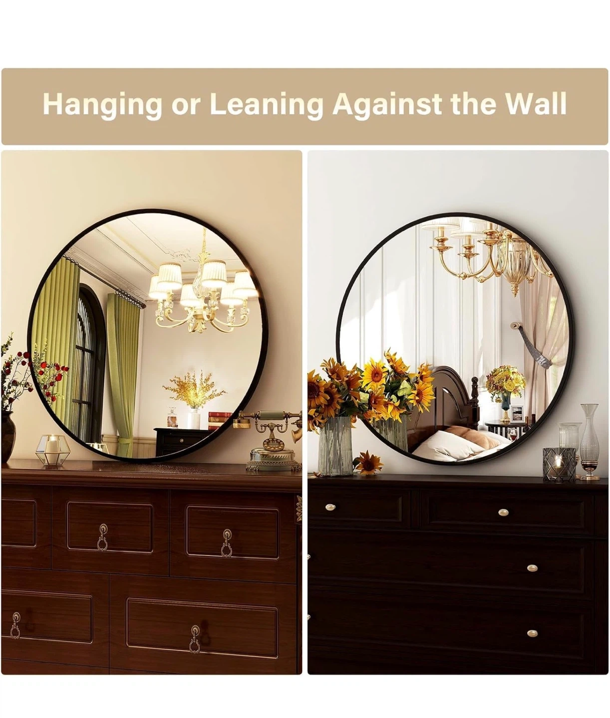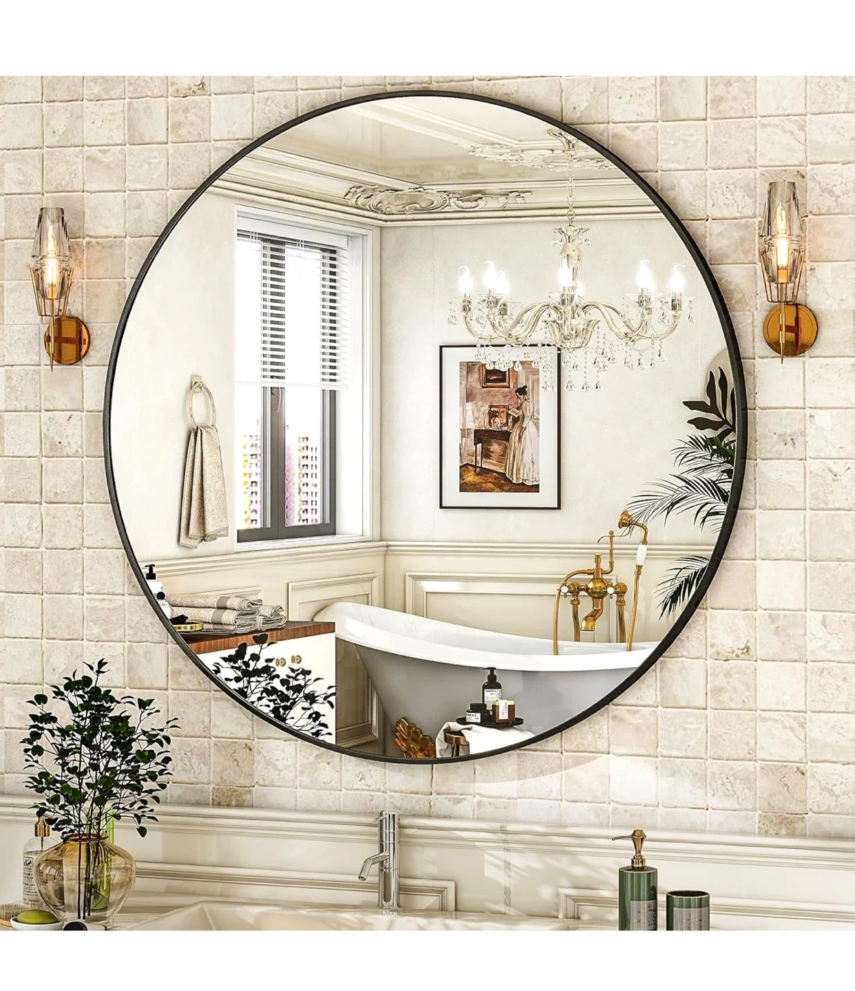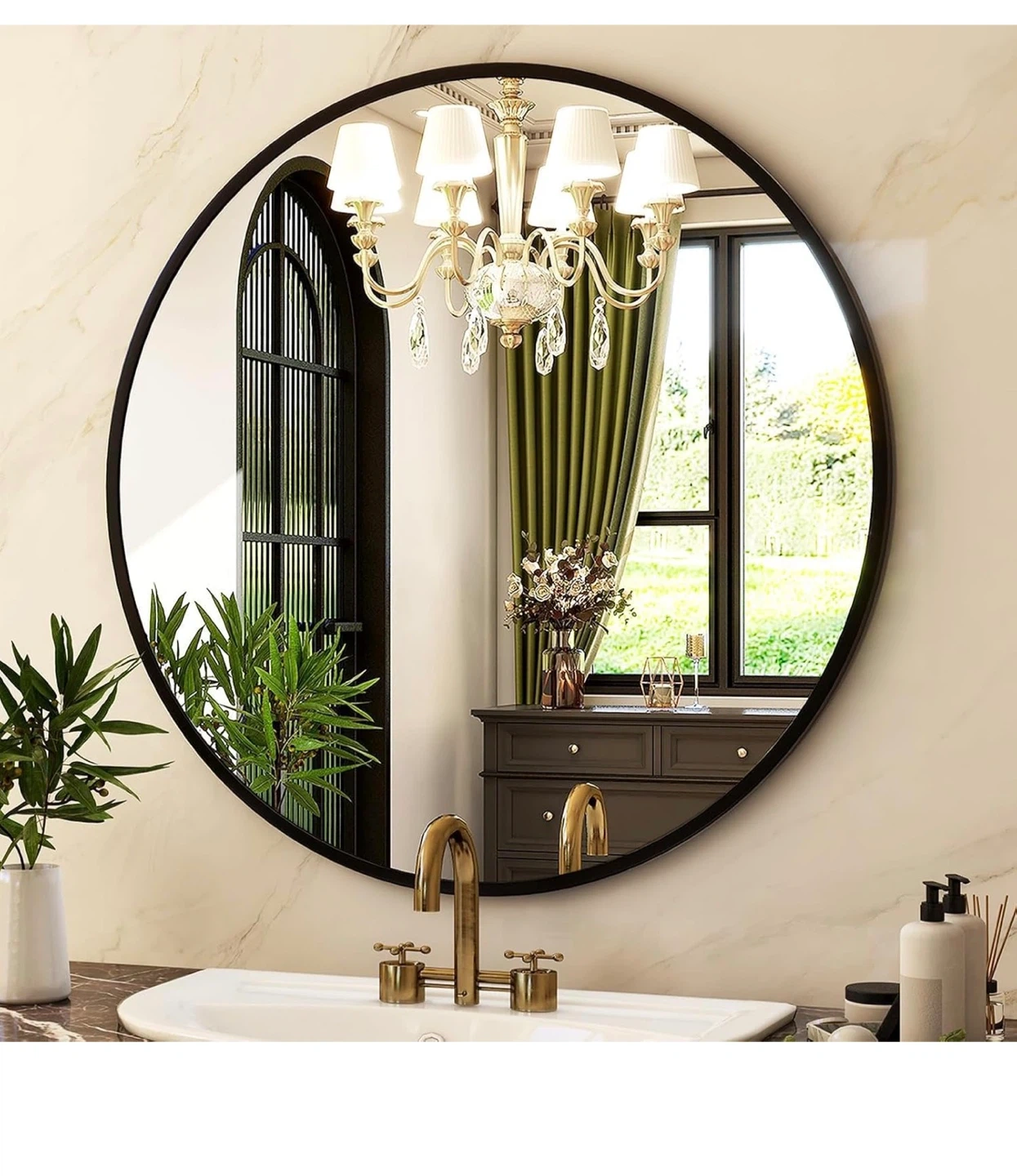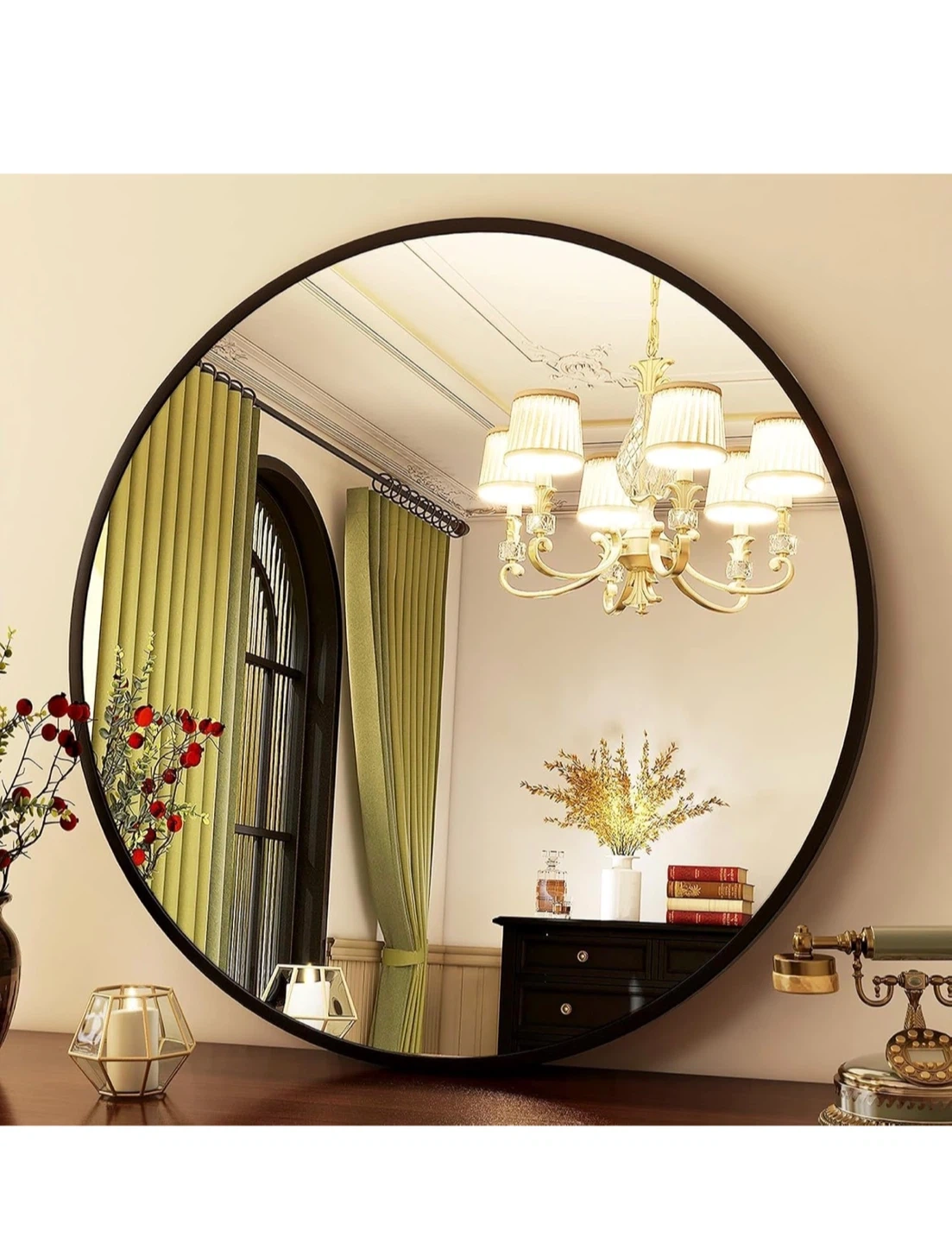 Selling a HARRITPURE round bathroom mirror with a sleek black aluminum alloy frame. It's a 30-inch circle wall mirror, perfect for adding a modern touch to your vanity, bedroom, or entryway. The mirror features HD no-distortion imaging and explosion-proof glass for added safety and peace of mind