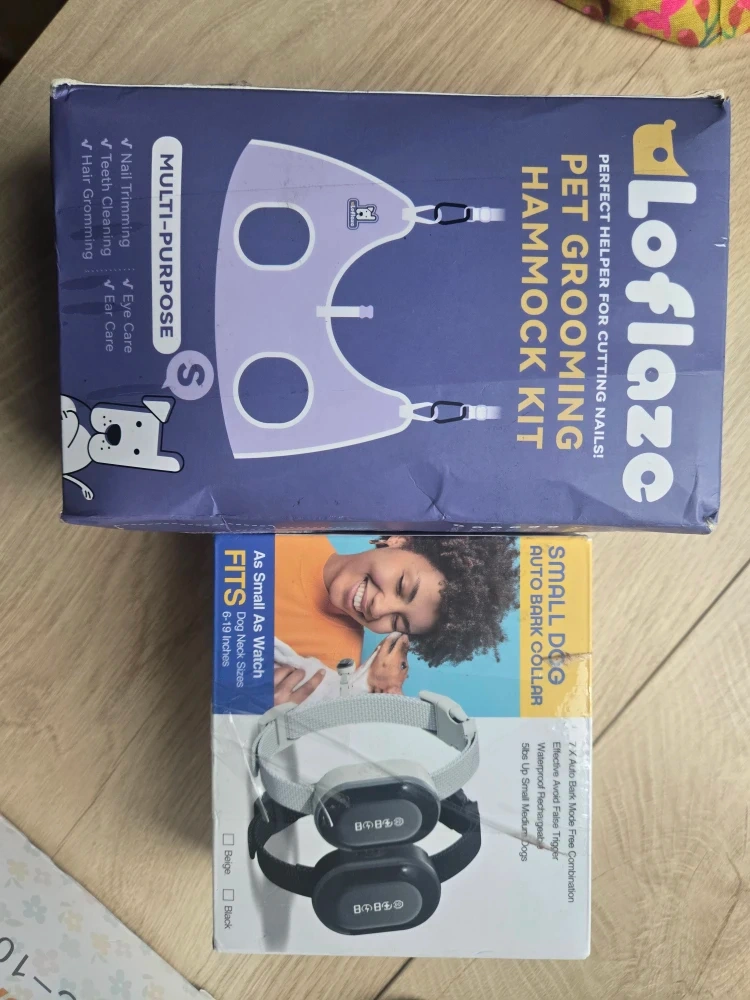 Selling new Loflaze pet grooming hammock kit, perfect for cutting nails, nail trimming, teeth cleaning, eye care, ear care, and hair grooming! 2nd item is a small dog auto bark collar with 7 auto bark modes, waterproof, and rechargeable, suitable for small to medium dogs. The collar fits dog neck sizes 6-19 inches.