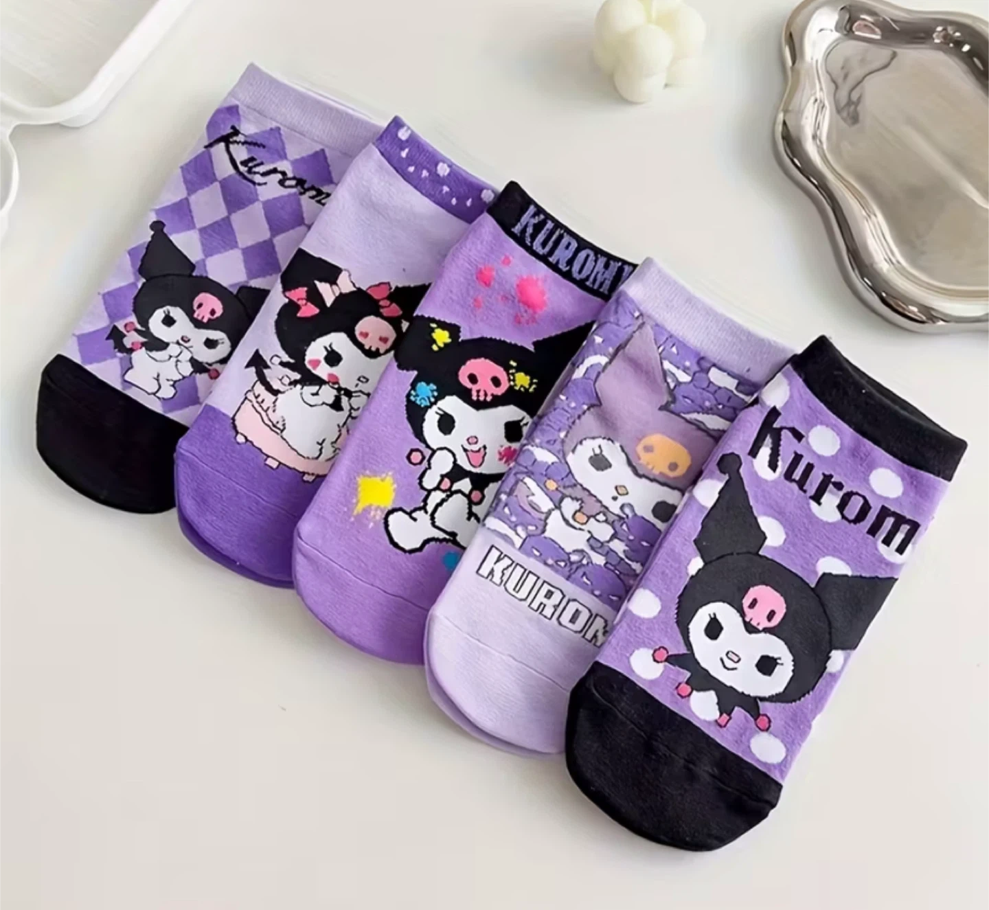 Check out these adorable Kuromi character socks! They're perfect for adding a touch of fun to any outfit. The socks feature various Kuromi designs and are made from a comfortable material. Great for everyday wear!
