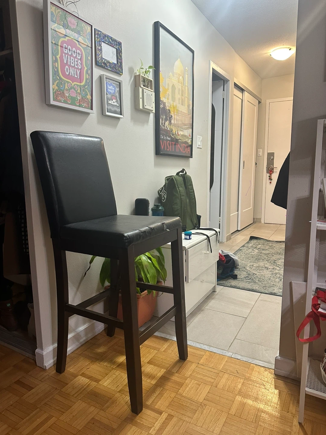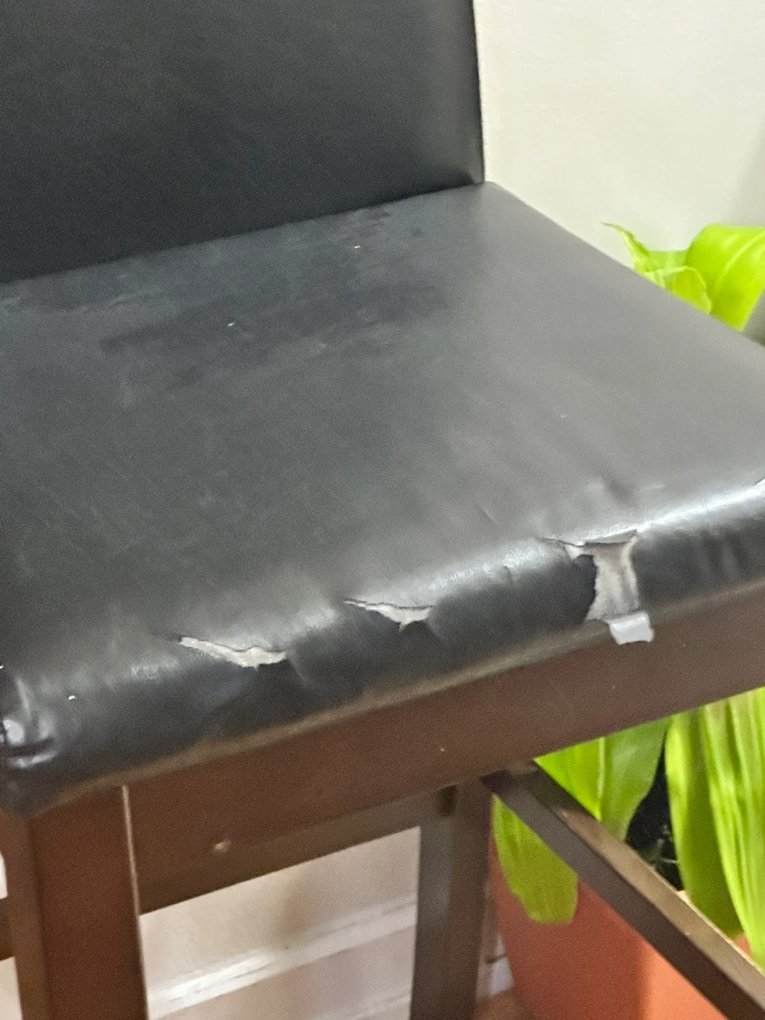 Selling a set of two black bar stools. The seats show some wear and tear, as pictured. Could be concealed with seat cloth. Still sturdy, good padding and functional!