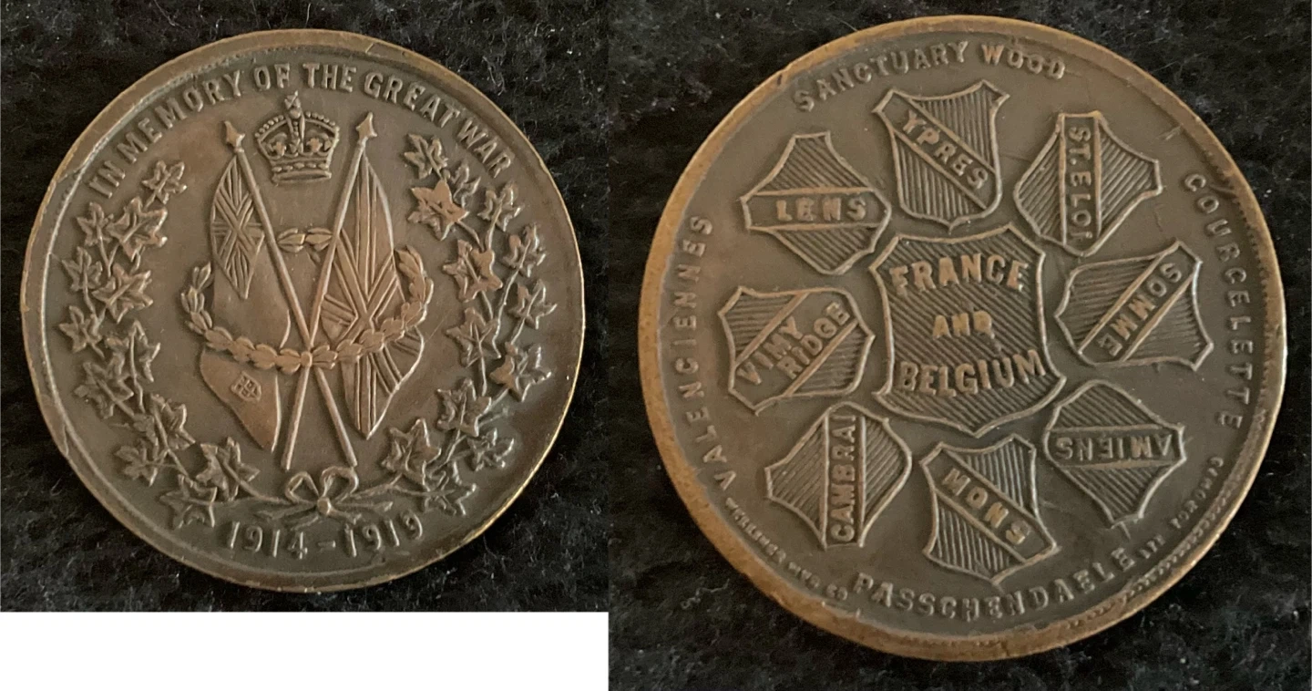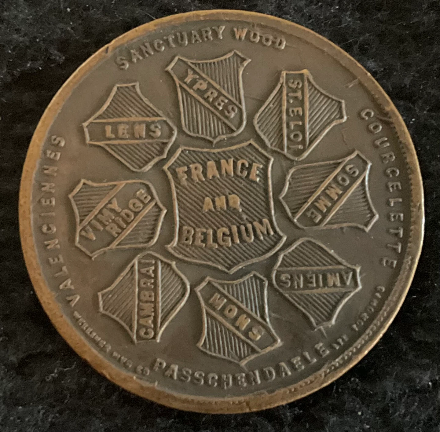 Selling a vintage medal coin commemorating the Great War (1914-1919). Features Sanctuary Wood, Ypres, Lens, Vimy Ridge, Cambrai, Mons, Amiens, Somme, St. Eloi, Courcelette, Valenciennes, and Passchendaele, with France and Belgium at the centre. A piece of history! Made from copper by the Wellings Mint (then in Scarborough, Ontario) in 1920.