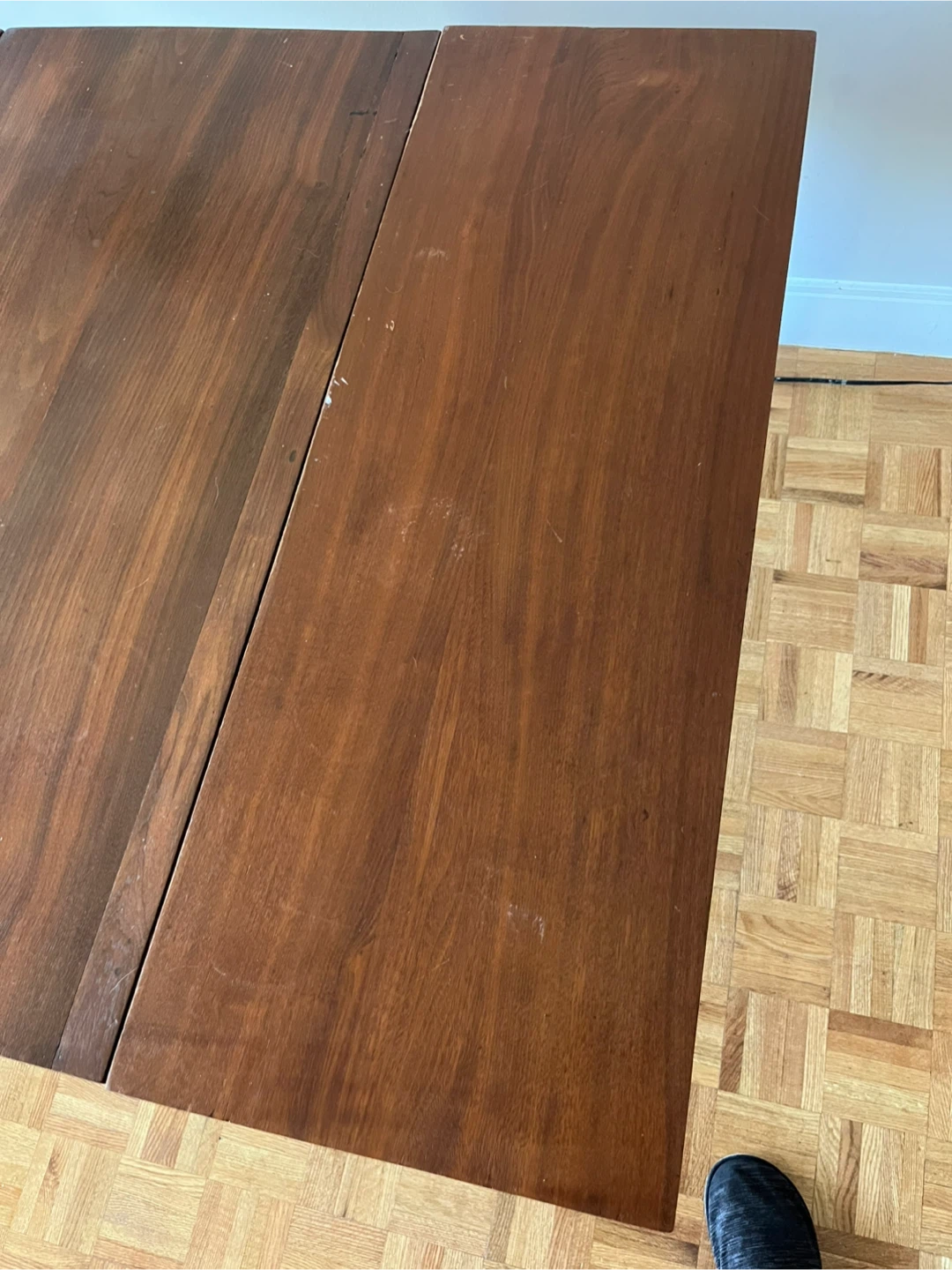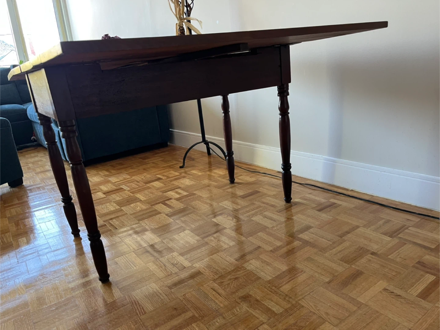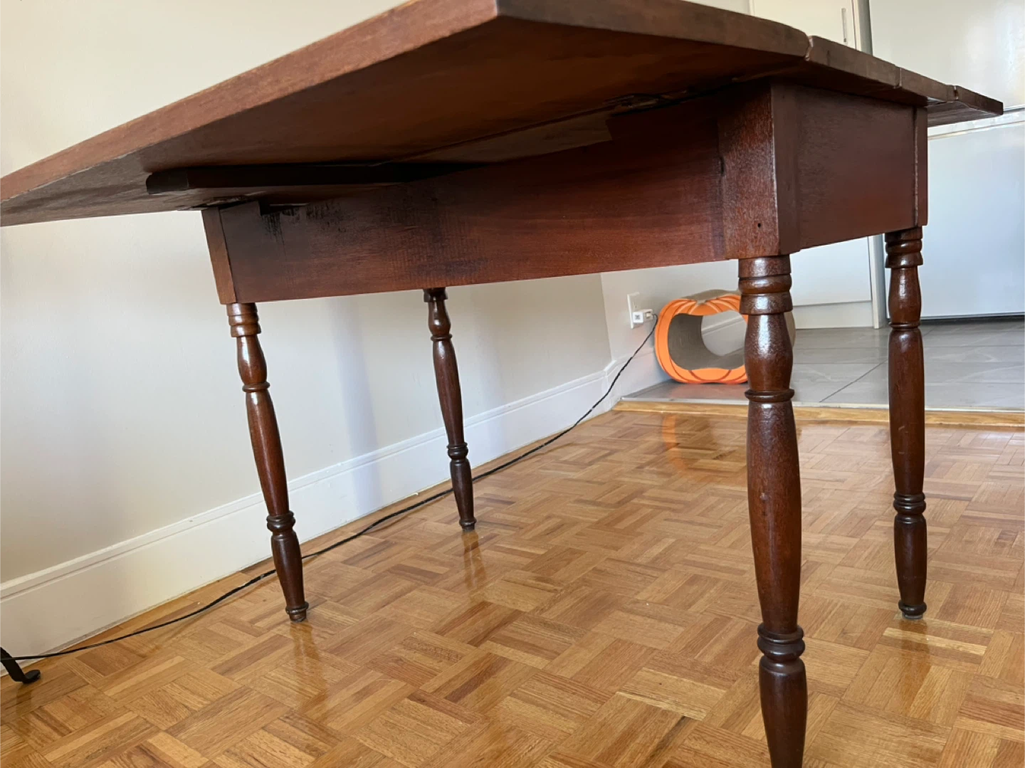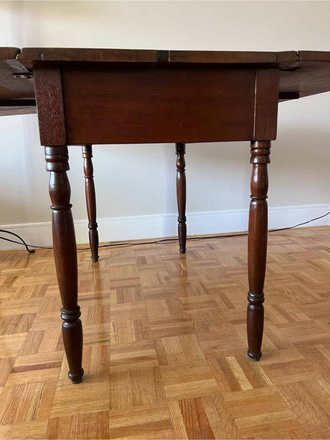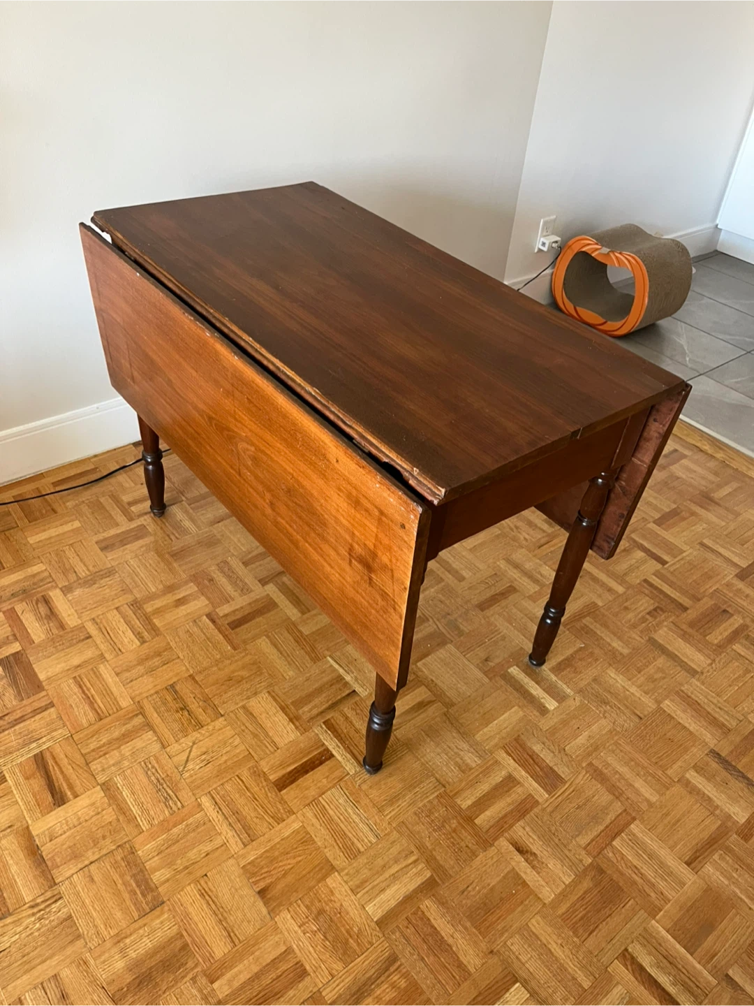 Selling a charming antique drop-leaf table with a classic wood finish. The table has a timeless design and both leaves can be folded down, making it practical for small spaces or full use when extended.
