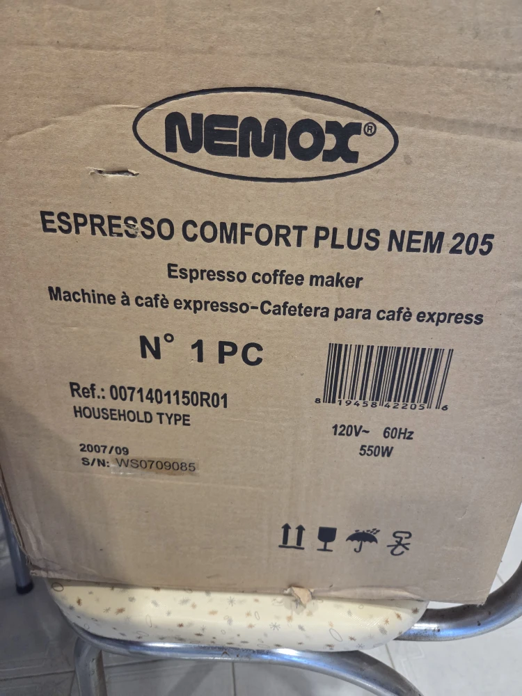 Selling a Nemox Espresso Comfort Plus NEM 205 espresso coffee maker. It's in good condition and ready to make delicious espresso at home. Household type, 120V, 60Hz, 550W. Get ready to enjoy cafe-quality espresso! Brand new. Box is damaged. Compatible pods sold at specialty coffee stores and on Amazon. Lavazza: "Crema e Gusto" Pods (36 Individually Wrapped Pods) [ Italian Import ] https://a.co/d/5XOkyoH