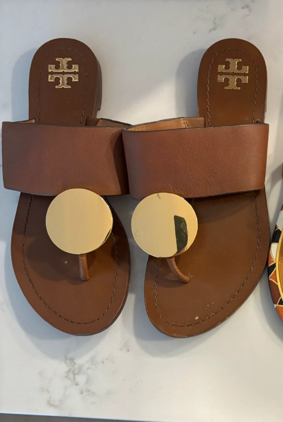 Selling a pair of Tory Burch sandals in brown leather! They feature a gold-tone circular embellishment. There are some signs of wear on the gold embellishment, but otherwise in good condition