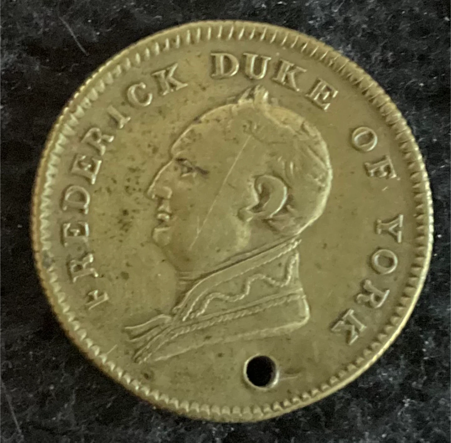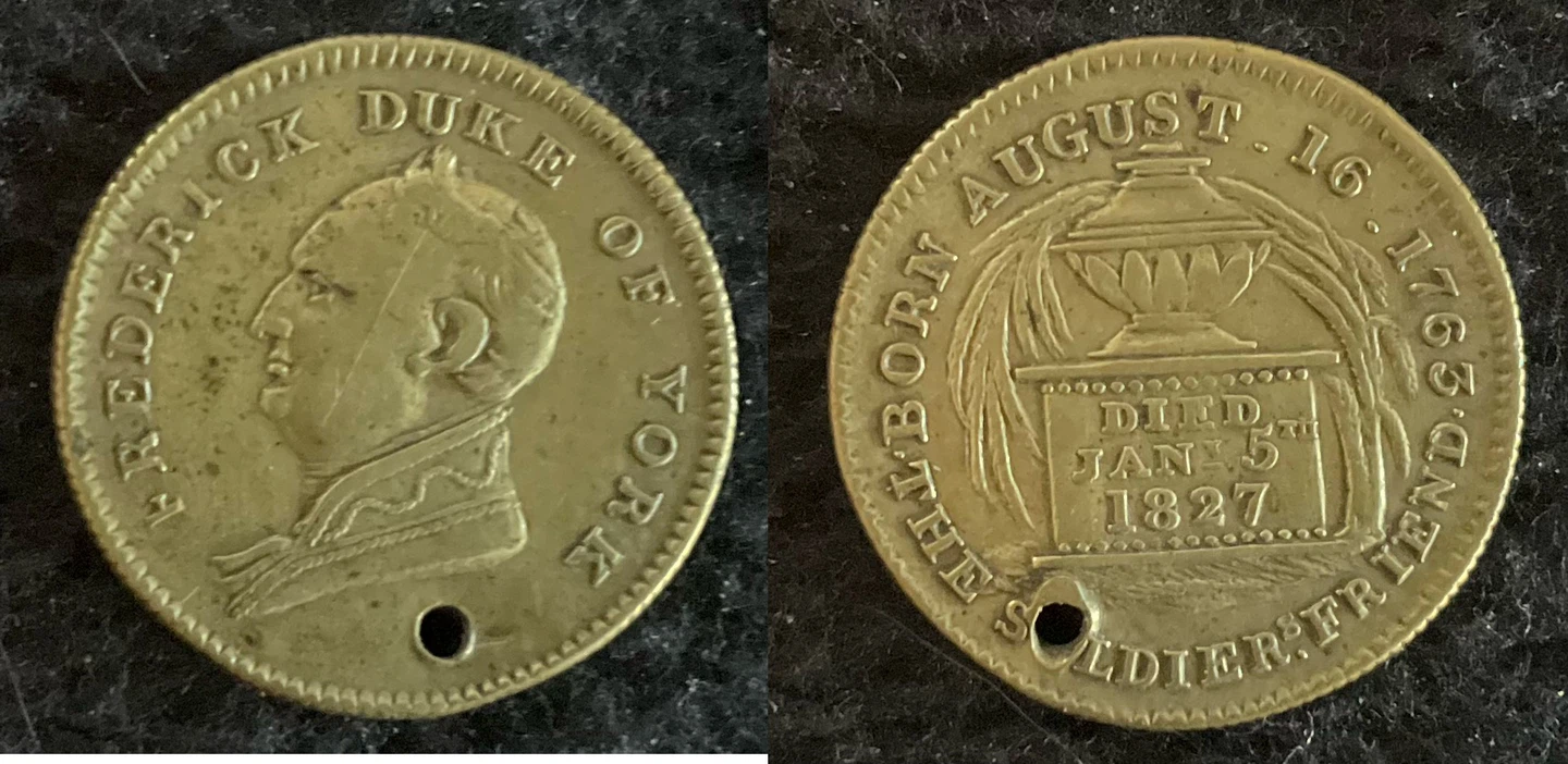 Selling a Frederick Duke of York Medalet manufactured in 1827. The coin commemorates the Duke's life, noting he was born August 16, 1763, and died January 5, 1827. A unique piece for collectors.