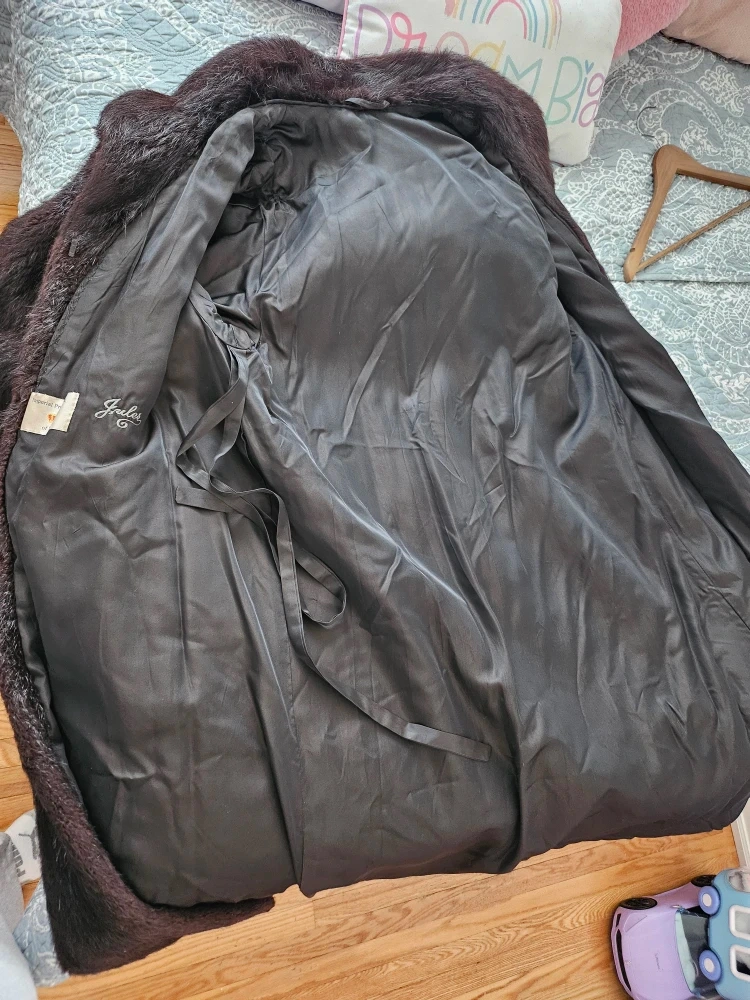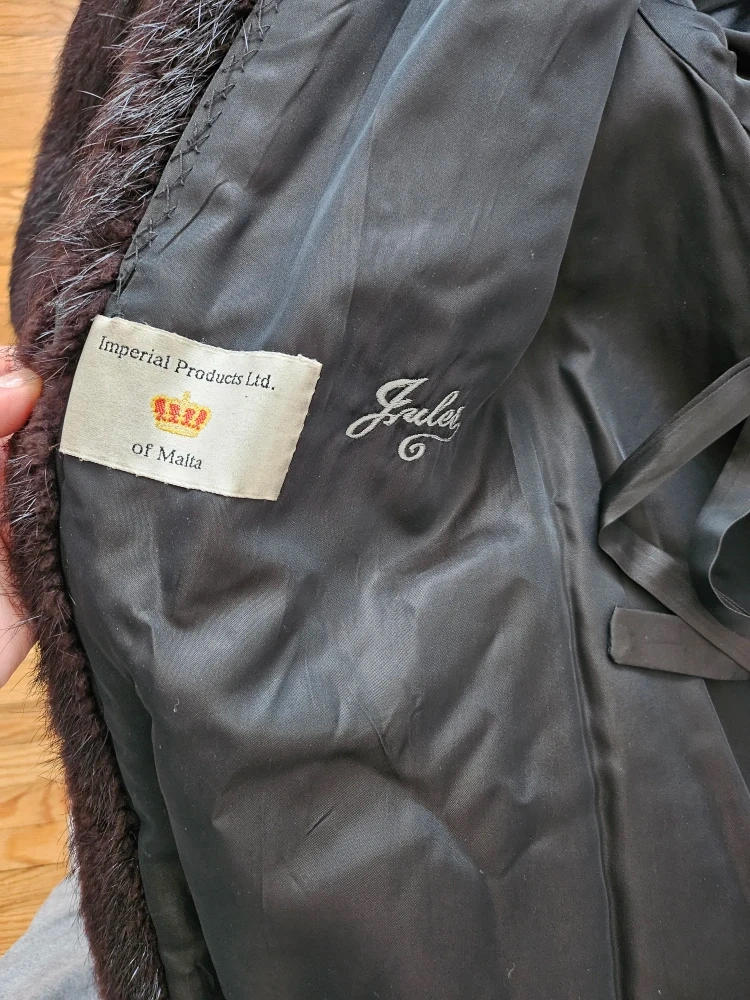 Selling a vintage fur coat from Imperial Products Ltd. The interior lining is in good condition and features a tie closure. It's a beautiful piece!