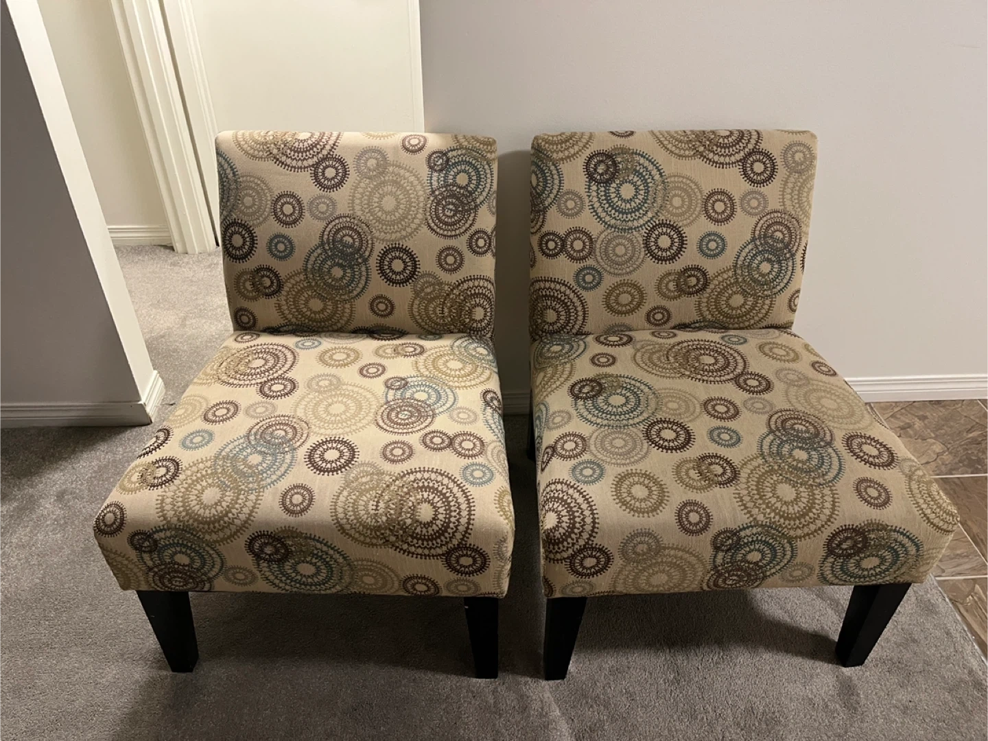 Selling a pair of accent chairs! They have a unique pattern and are in great condition. Just need little bit cleaning. Perfect for adding a touch of style to any room. Bring cash only.