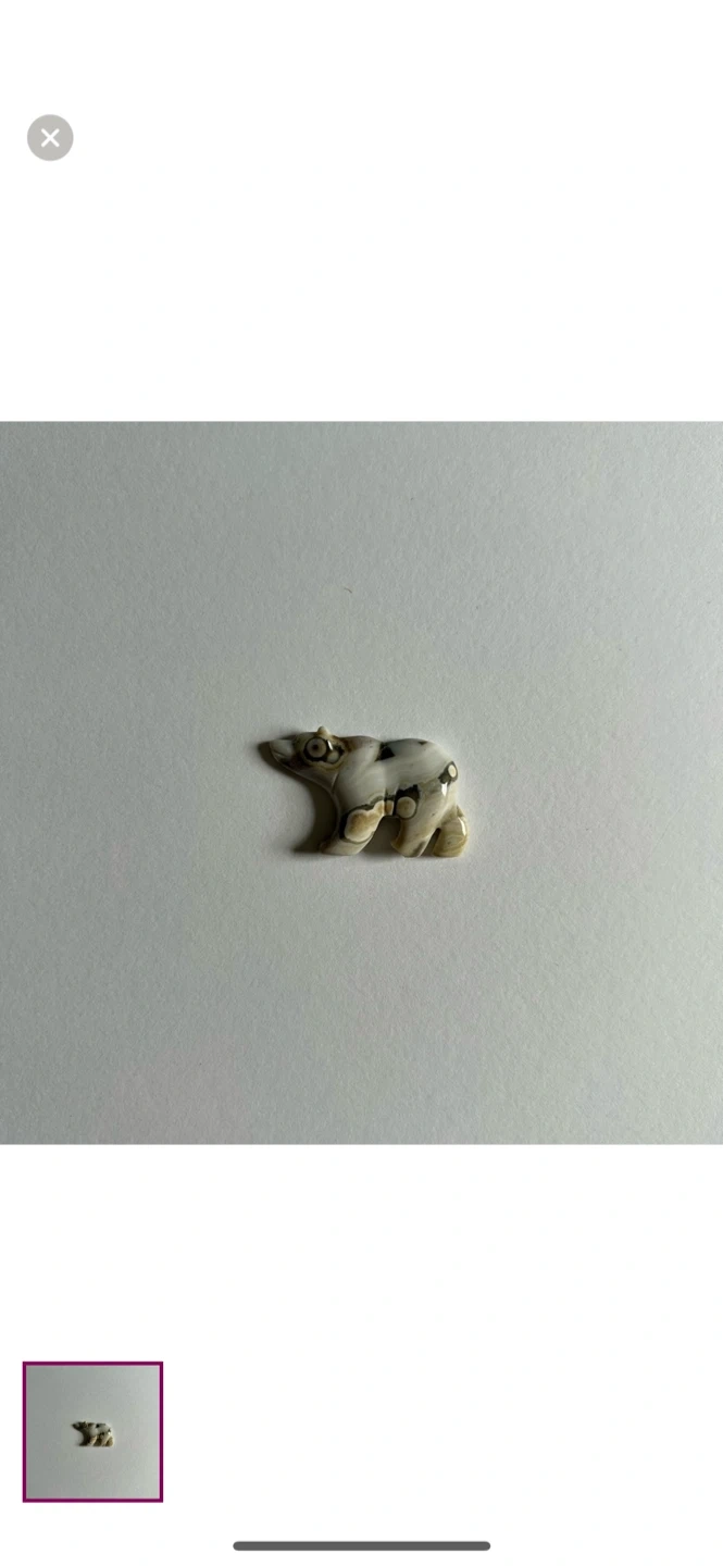 This is a small polar bear figurine, carved from stone. It has a unique design with varying shades of white and brown. It would make a lovely addition to any collection or as a decorative piece for your home. It’s small, about the size of a coin.