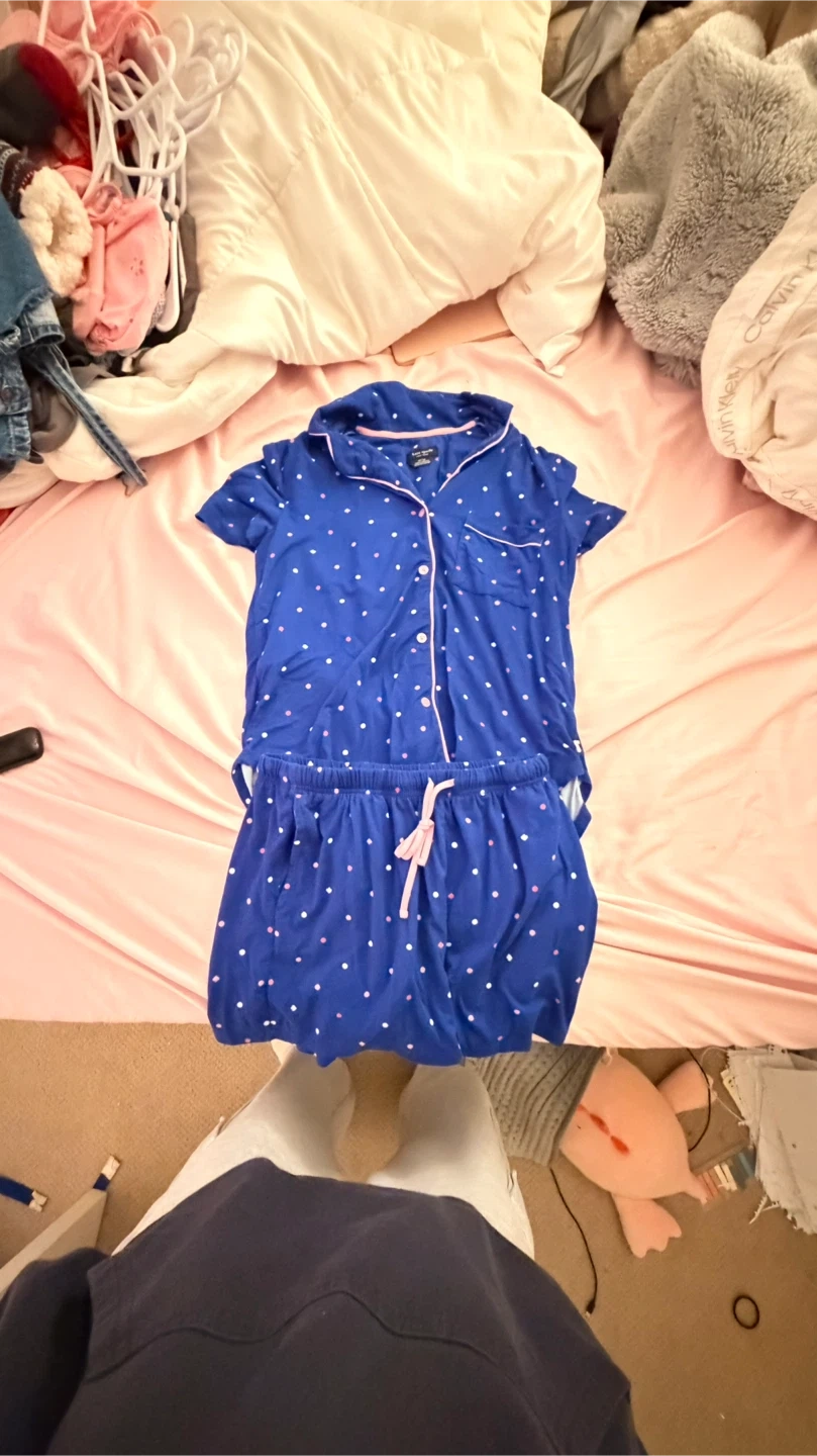 Cute Kate Spade pajama set in size XS! The set is a navy blue with a polka dot pattern. It includes a short-sleeved button-up top and shorts with a drawstring. Perfect for a comfy night's sleep!