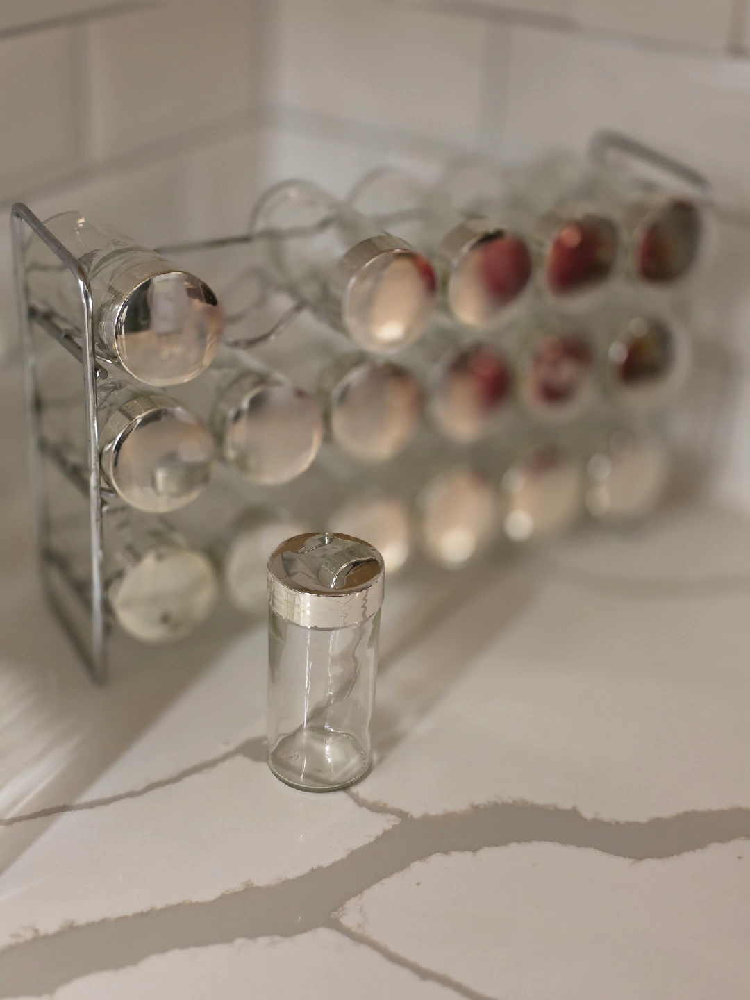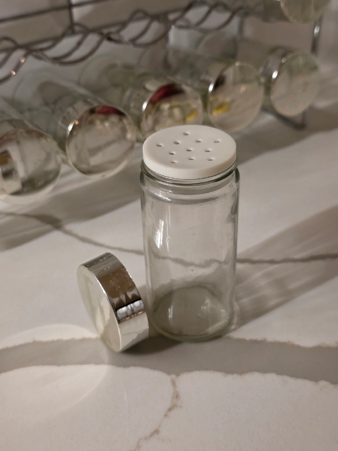 Selling a spice rack that comes with 18 glass jars. Each jar is about 4" tall and 1.5" inches in diameter. The rack is 11.75" X 4" X 7.5". There are some areas of ware from use but other then that its perfect for organizing your spices in the kitchen!