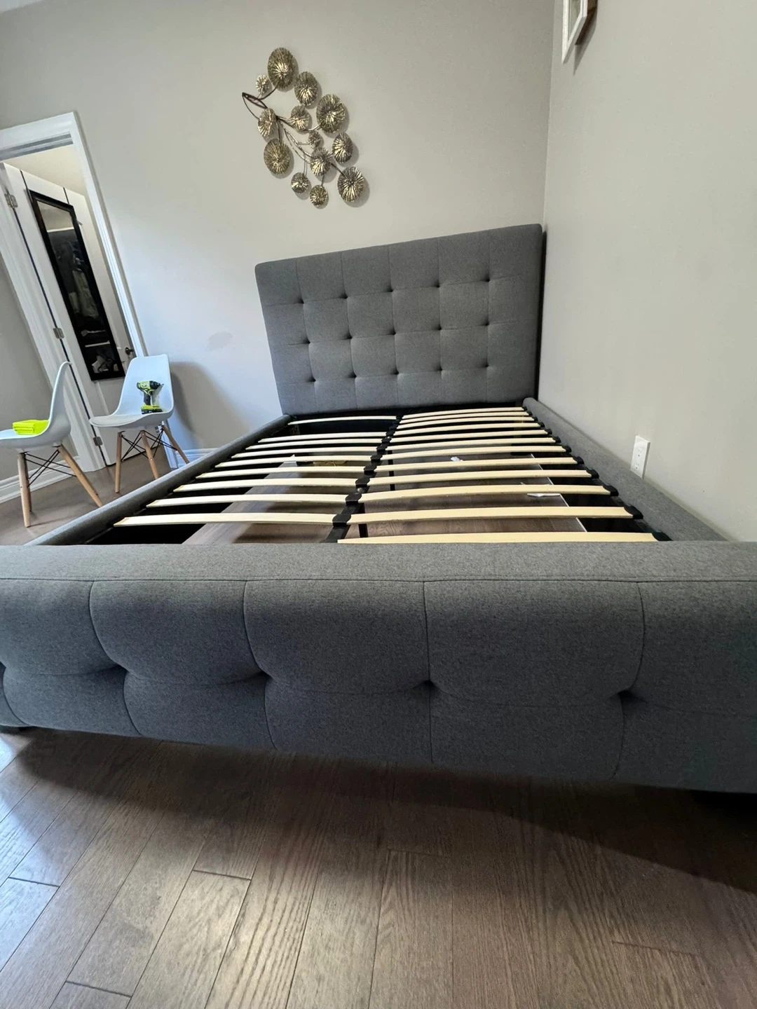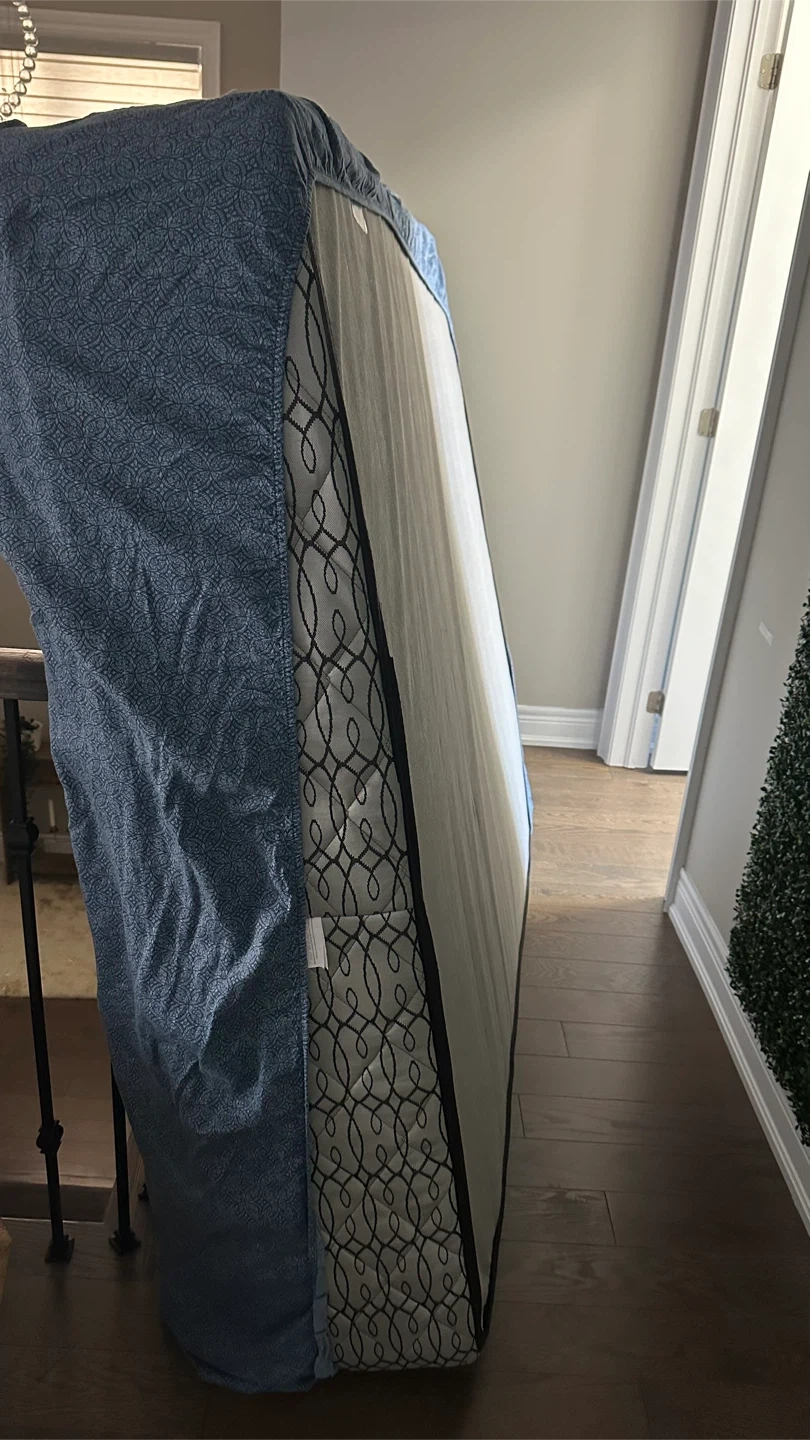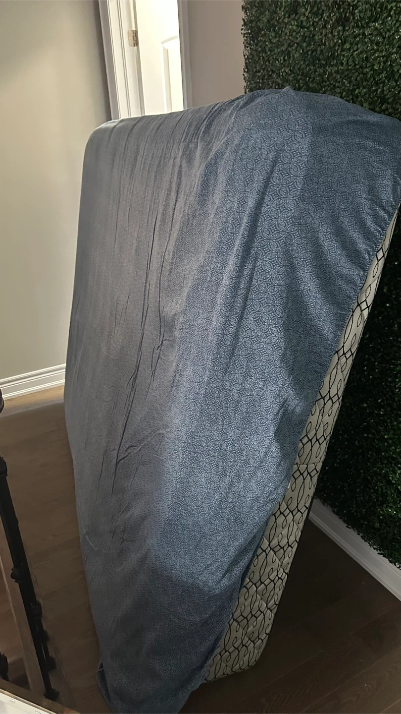 Selling a Costco queen size grey upholstered platform bed frame with mattress. It's in great condition and ready for a new home! The bed frame features a tufted headboard and a sturdy platform base.