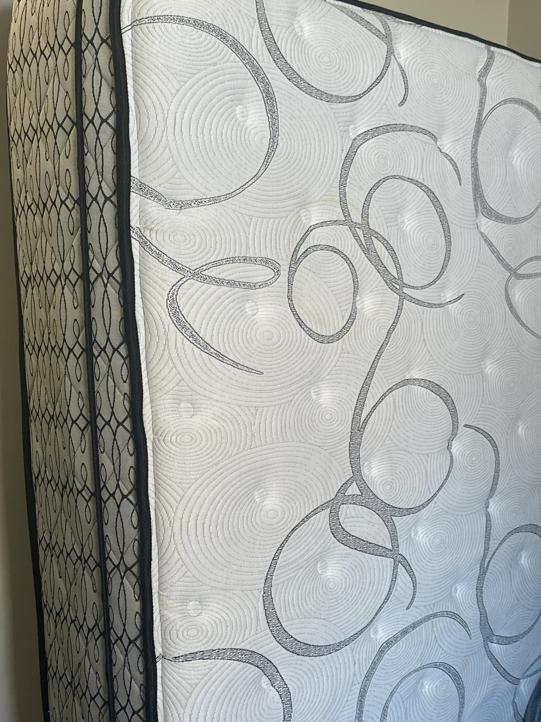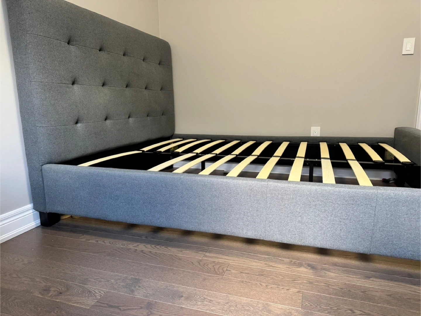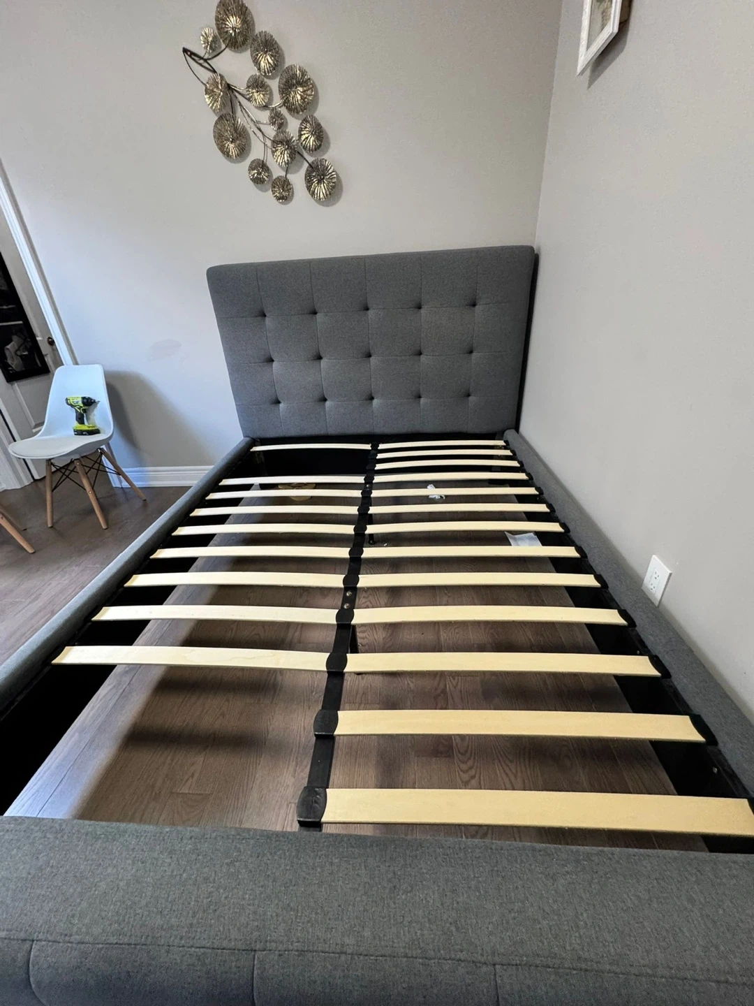 Selling a Costco queen size grey upholstered platform bed frame with mattress. It's in great condition and ready for a new home! The bed frame features a tufted headboard and a sturdy platform base.