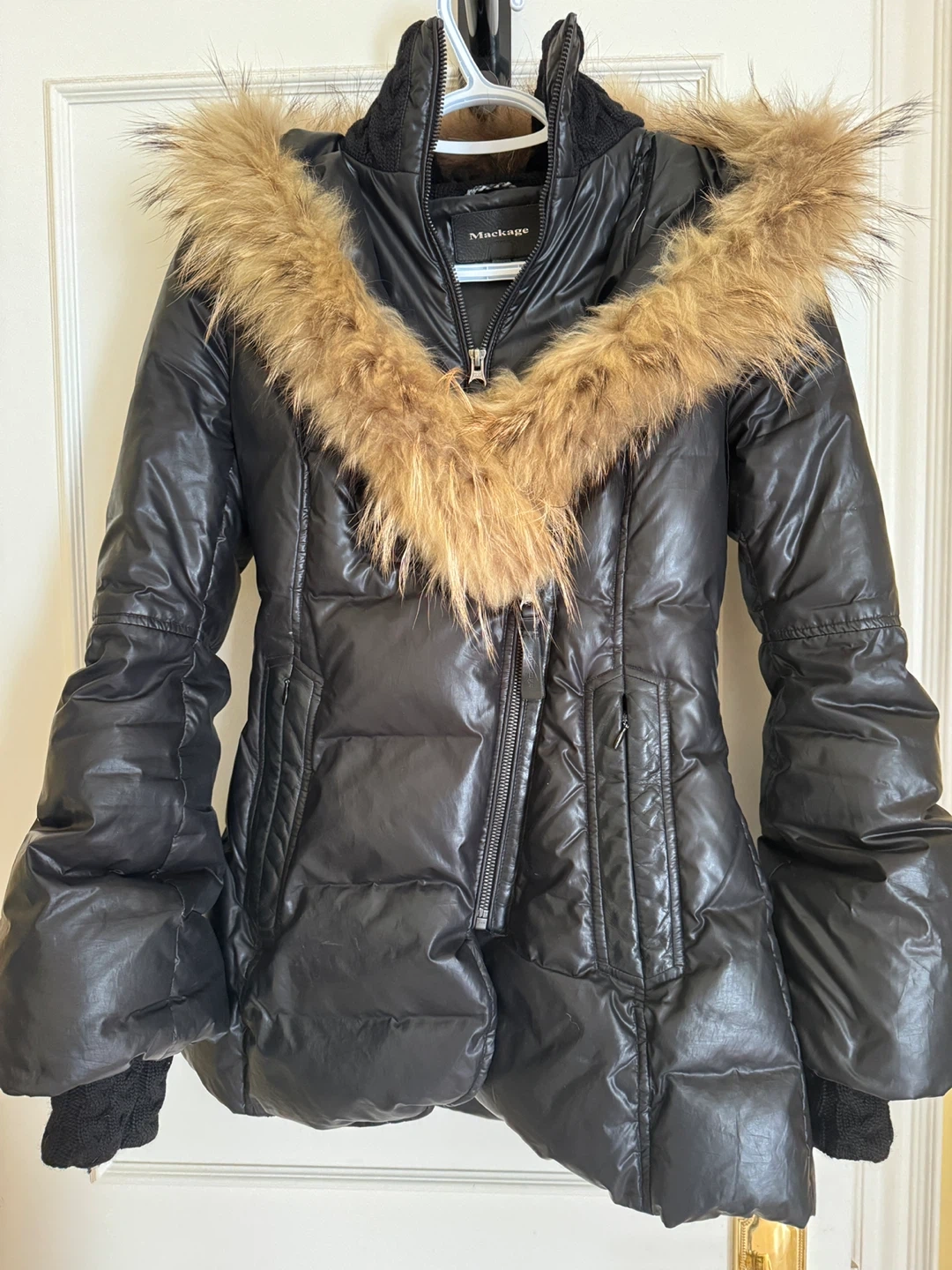 Selling a Mackage down winter coat in size XXS. It's in great condition and ready to keep you warm this winter! The coat is black with a fur-trimmed hood.