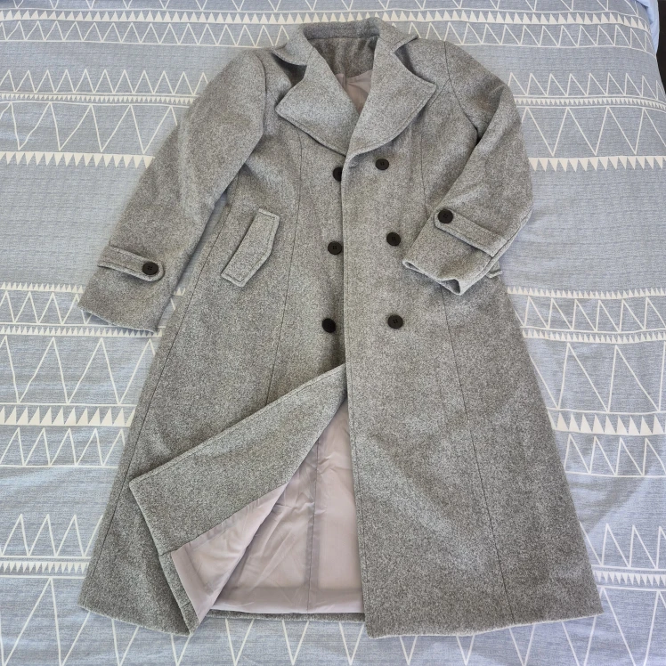 Here's a lovely grey overcoat, perfect for the Canadian weather! It's a wool blend material and features a classic double-breasted design with button details
