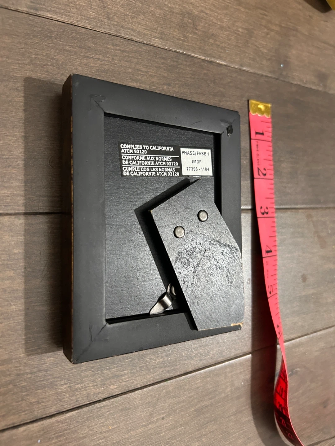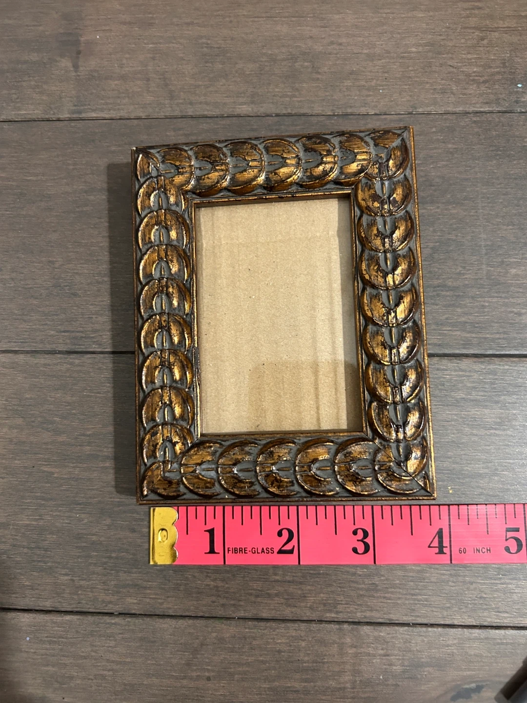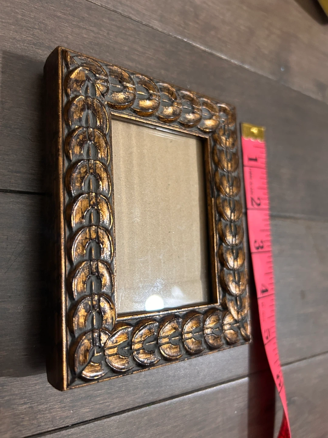 This is a small picture frame with a brown and gold finish. It measures roughly 2x3 inches. The back is black and includes a stand. Perfect for displaying your favourite memories!
