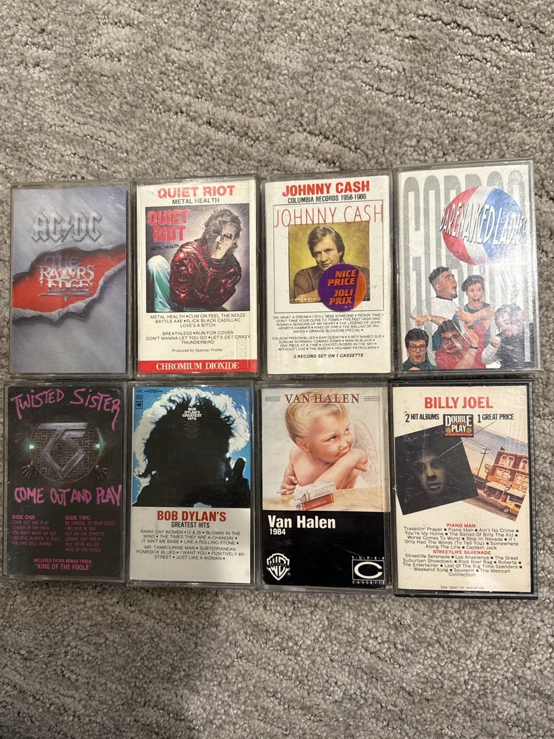Selling a collection of cassette tapes featuring various artists like AC/DC, Quiet Riot, Johnny Cash, Twisted Sister, Bob Dylan, Van Halen, Billy Joel, and Barenaked Ladies! All in good condition for their age. A great find for any cassette collector or music enthusiast looking for some classic tunes!