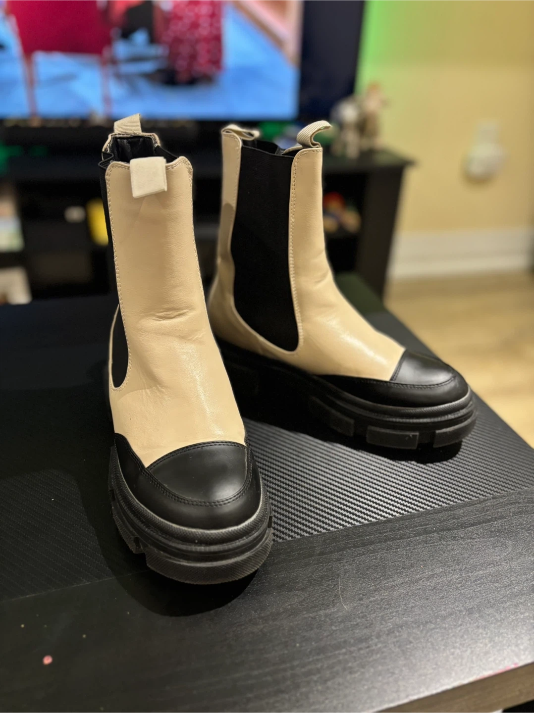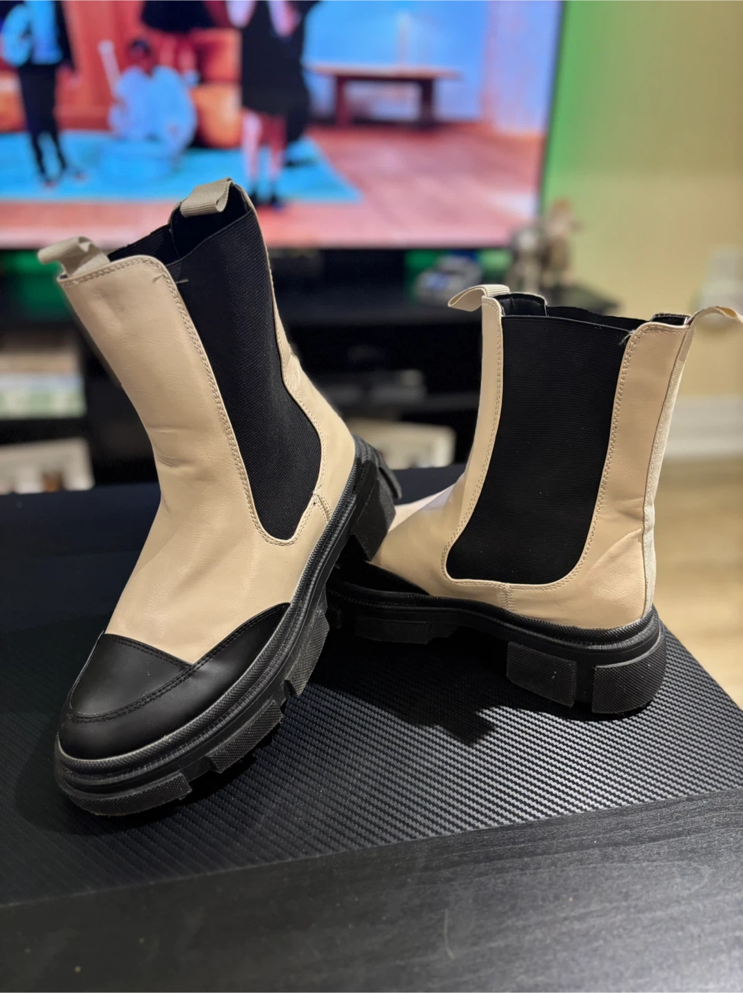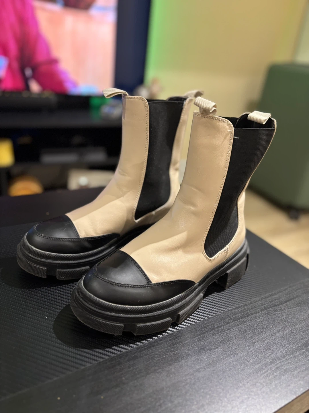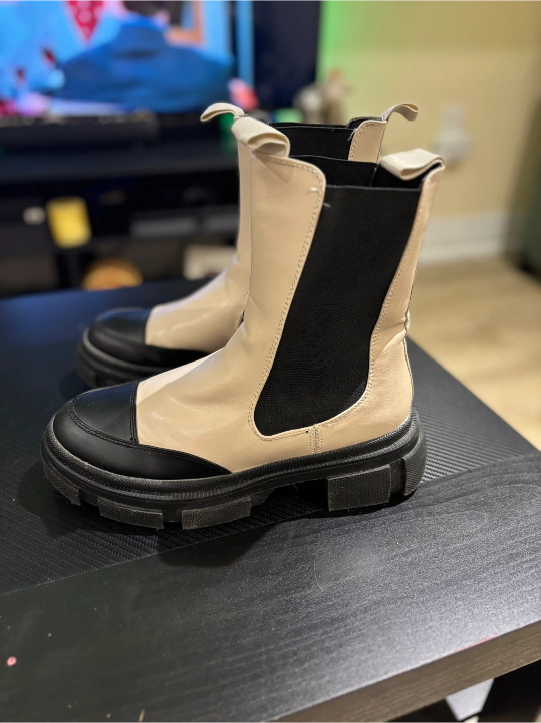 10Selling a pair of Chelsea boots in beige and black. They're in great condition and have a stylish, chunky sole. Size US 8 UK 6