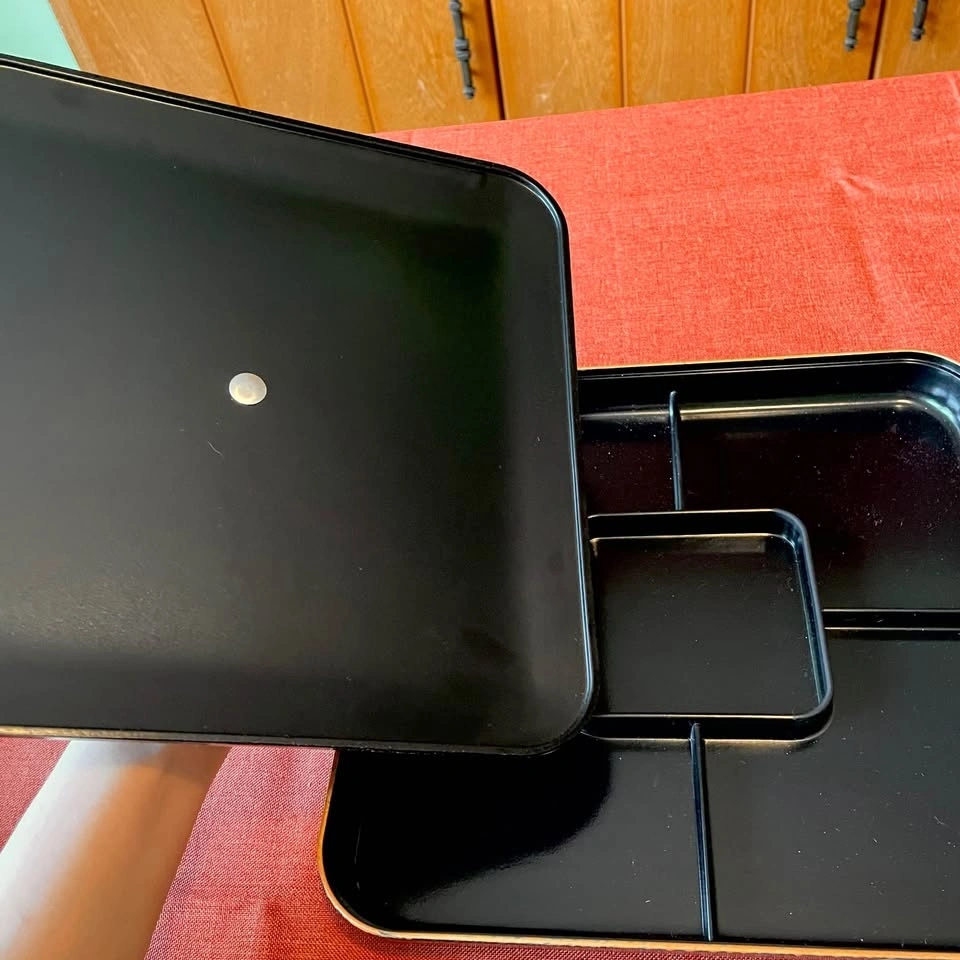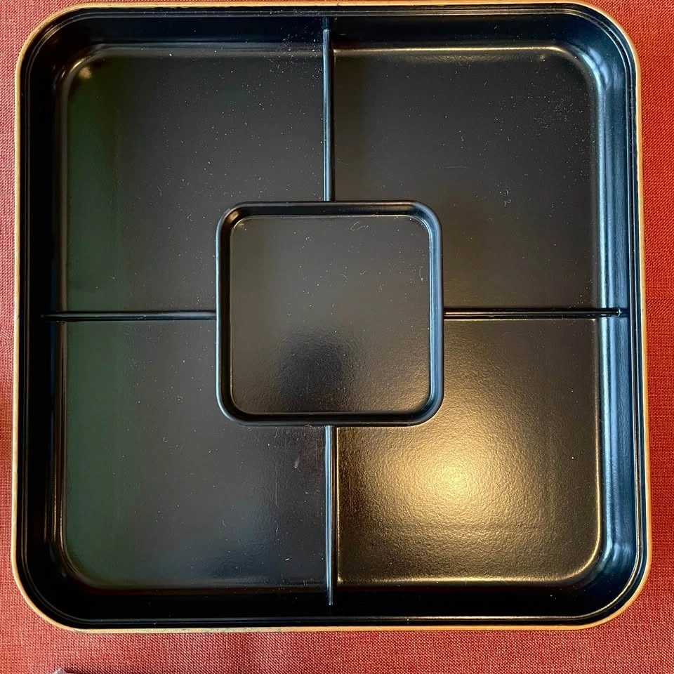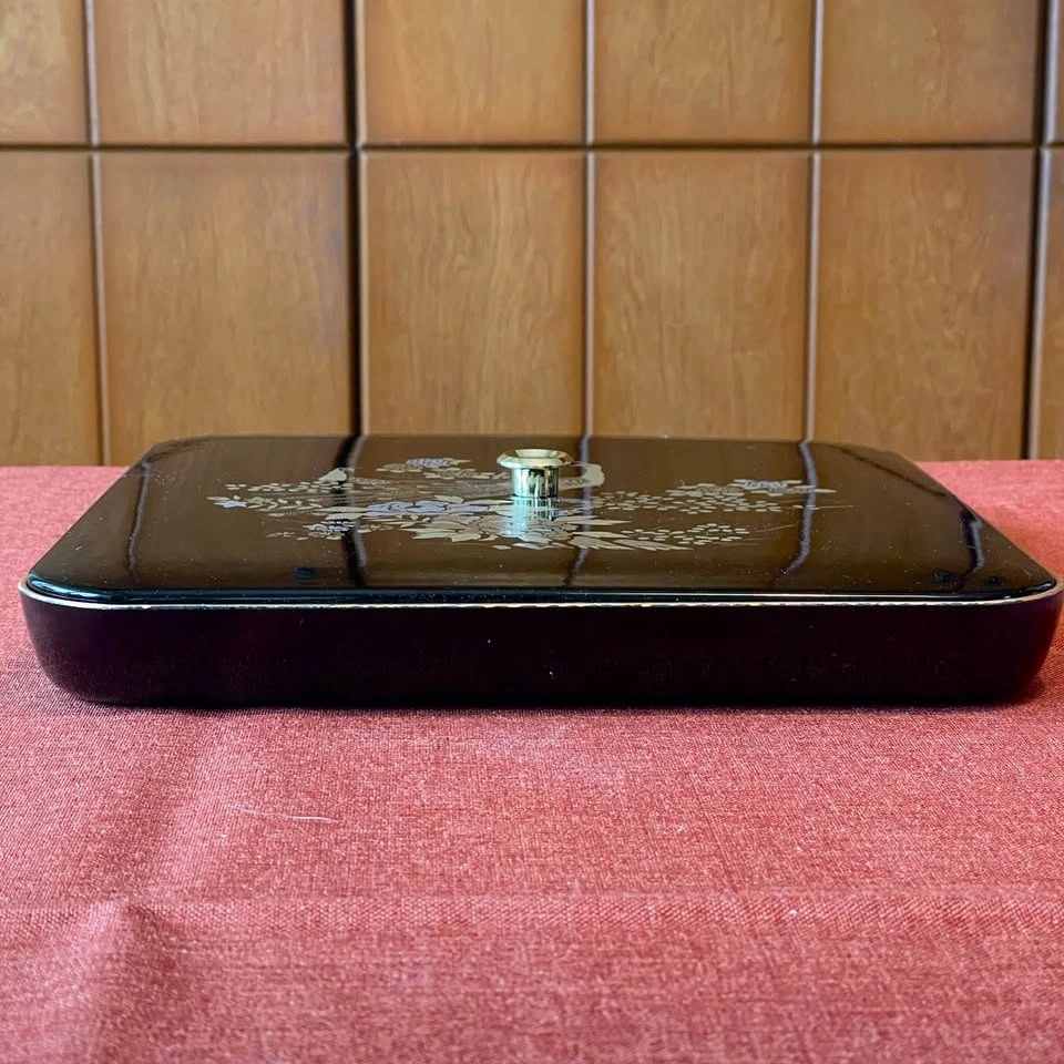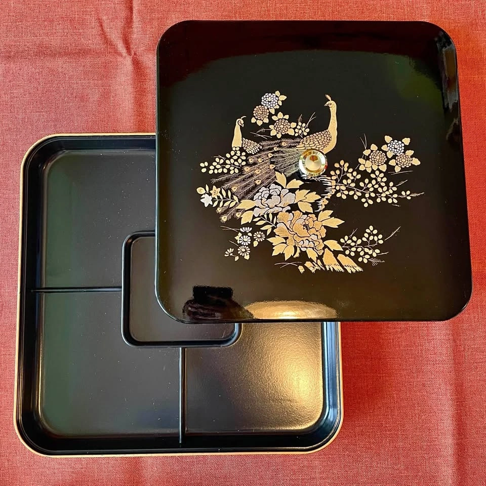 Vintage Japanese black lacquered box featuring a gold peacock and floral design. Square shallow divided tray with lid, perfect for display, storage, serving, or holding jewelry.
