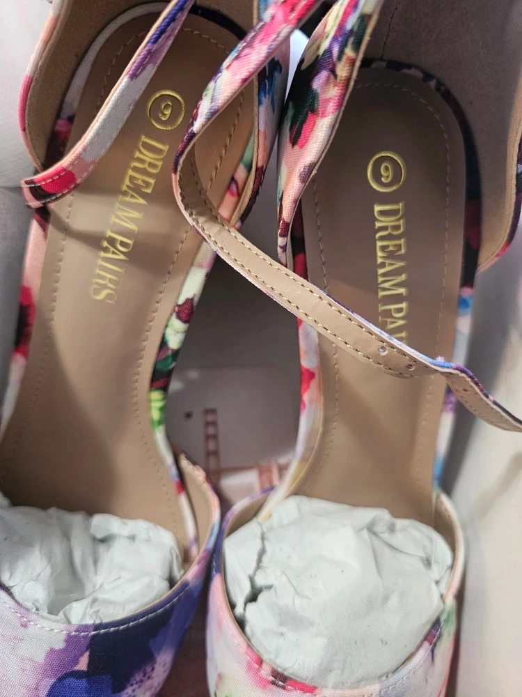 These Dream Pairs heels feature a beautiful floral pattern and come in size 9. They are in great condition and include the original box. Perfect for adding a pop of colour to any outfit!