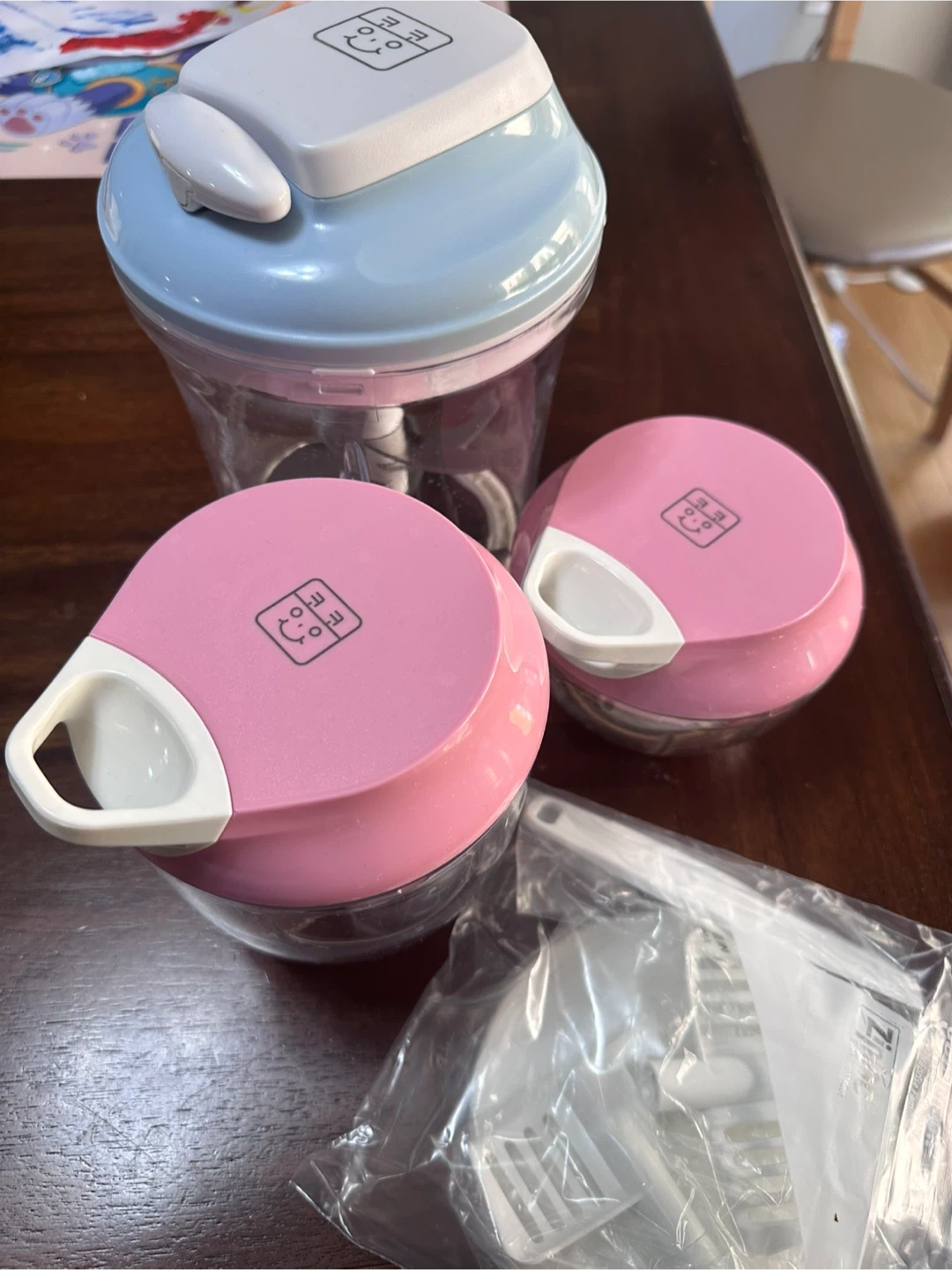 Selling a set of Momoya food choppers! Includes a larger chopper with a blue lid and two smaller choppers with pink lids. They're in great condition and come with some accessories still in their original packaging