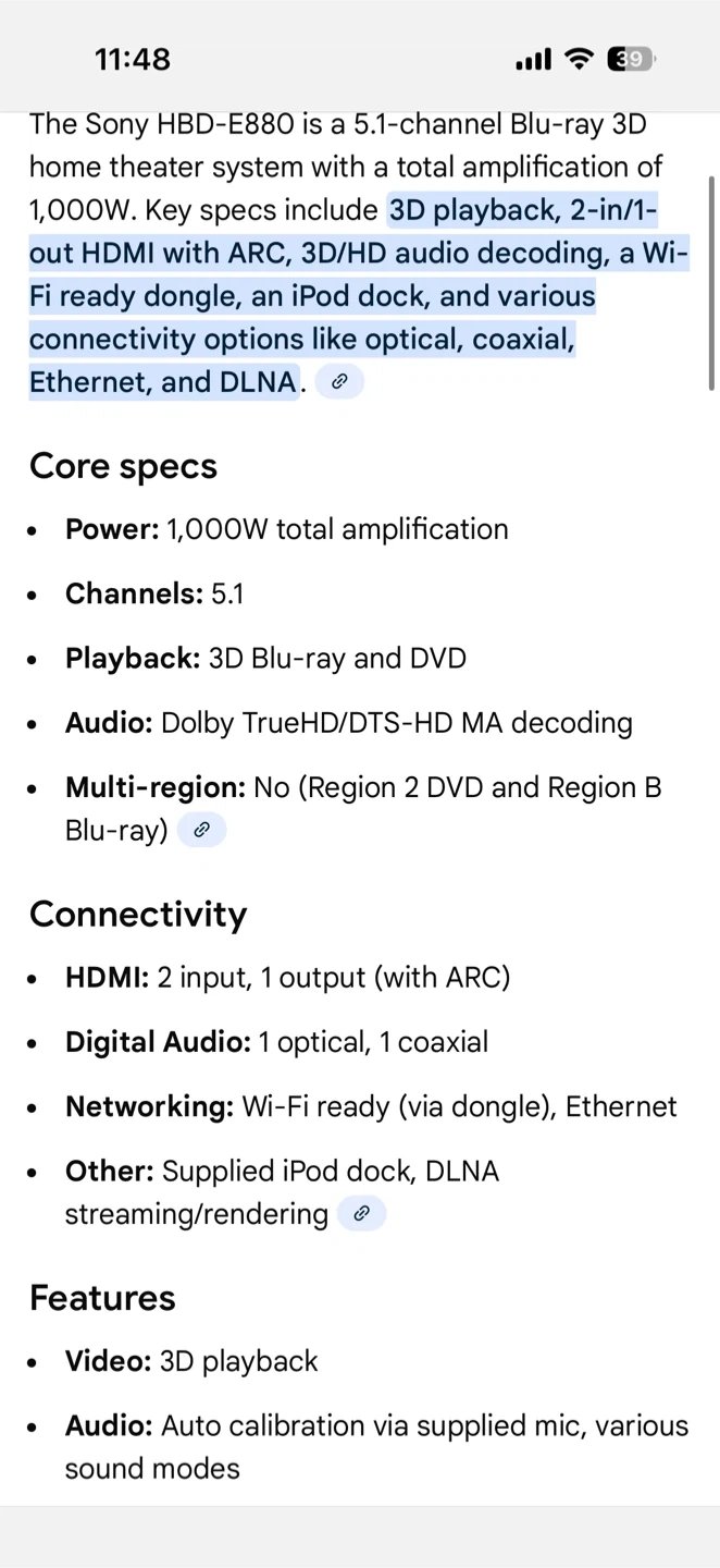 Selling a Sony HBD-E880 5.1-channel Blu-ray 3D home theatre system. It has a total amplification of 1,000W. No remote