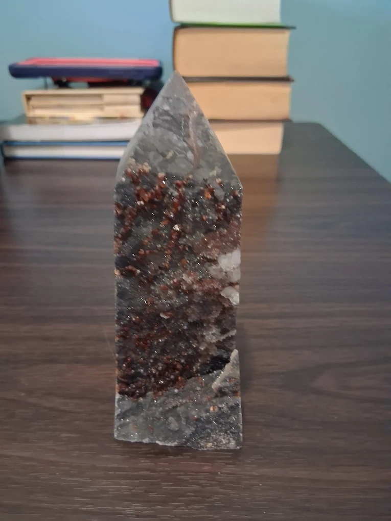 Druzy: The rougher, exposed surface features areas of druzy, which are tiny, sparkling crystals (likely quartz or micro-sphalerite) that grew on the surface of the matrix.