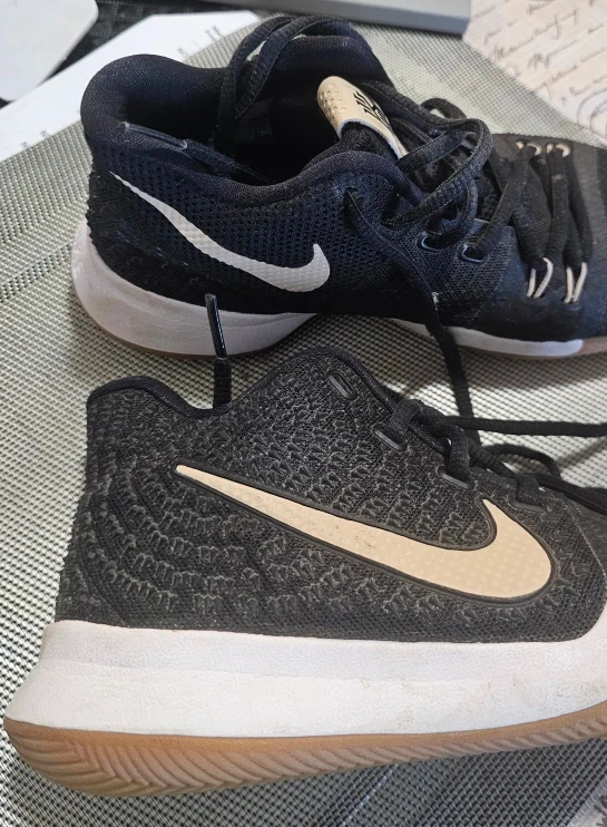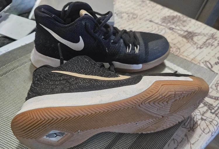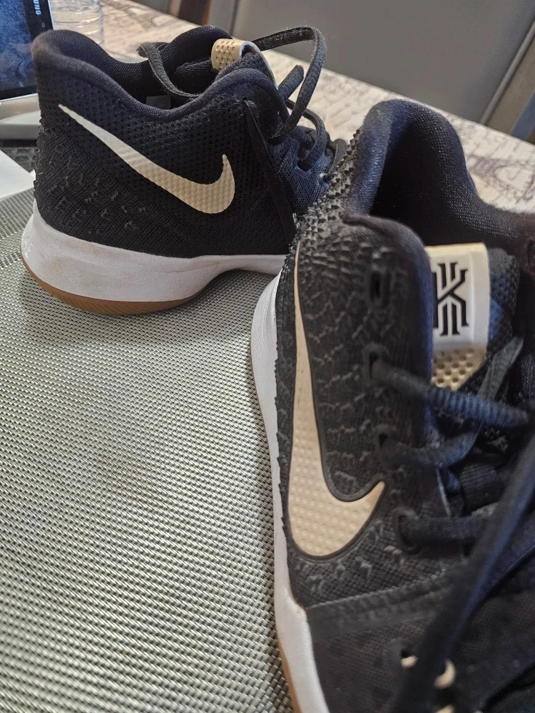 Selling a pair of Nike Kyrie Flytrap III basketball shoes. They're black with a white Nike swoosh and a white sole. They're in used condition, as you can see in the photos.