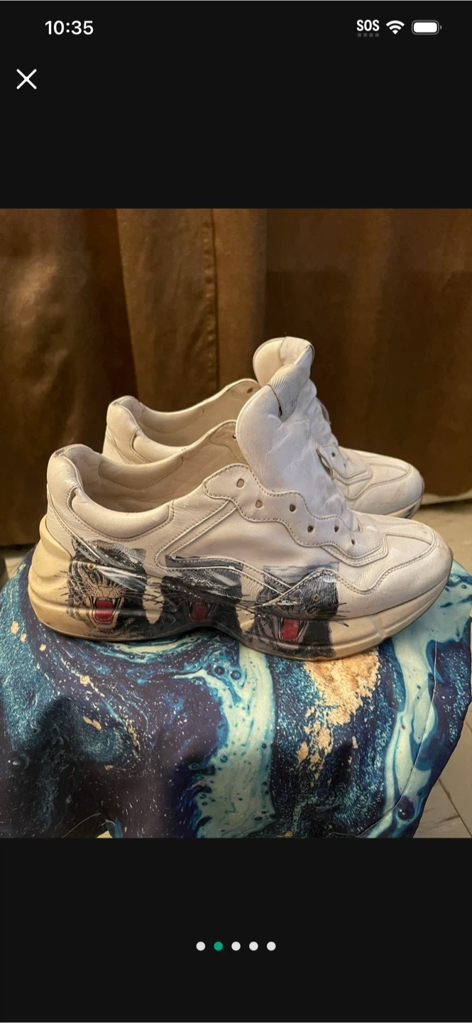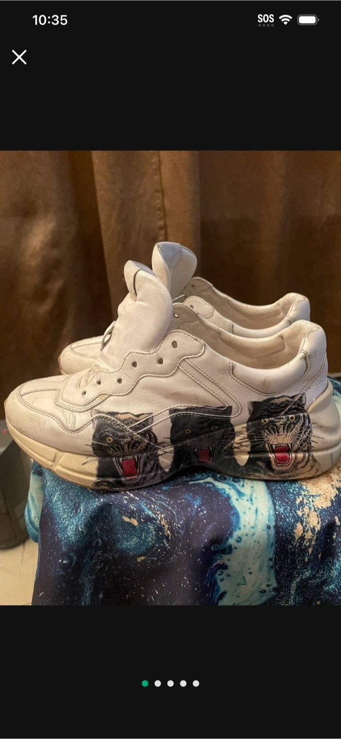 These sneakers feature a unique tiger design. They show some signs of wear, as seen in the pictures.