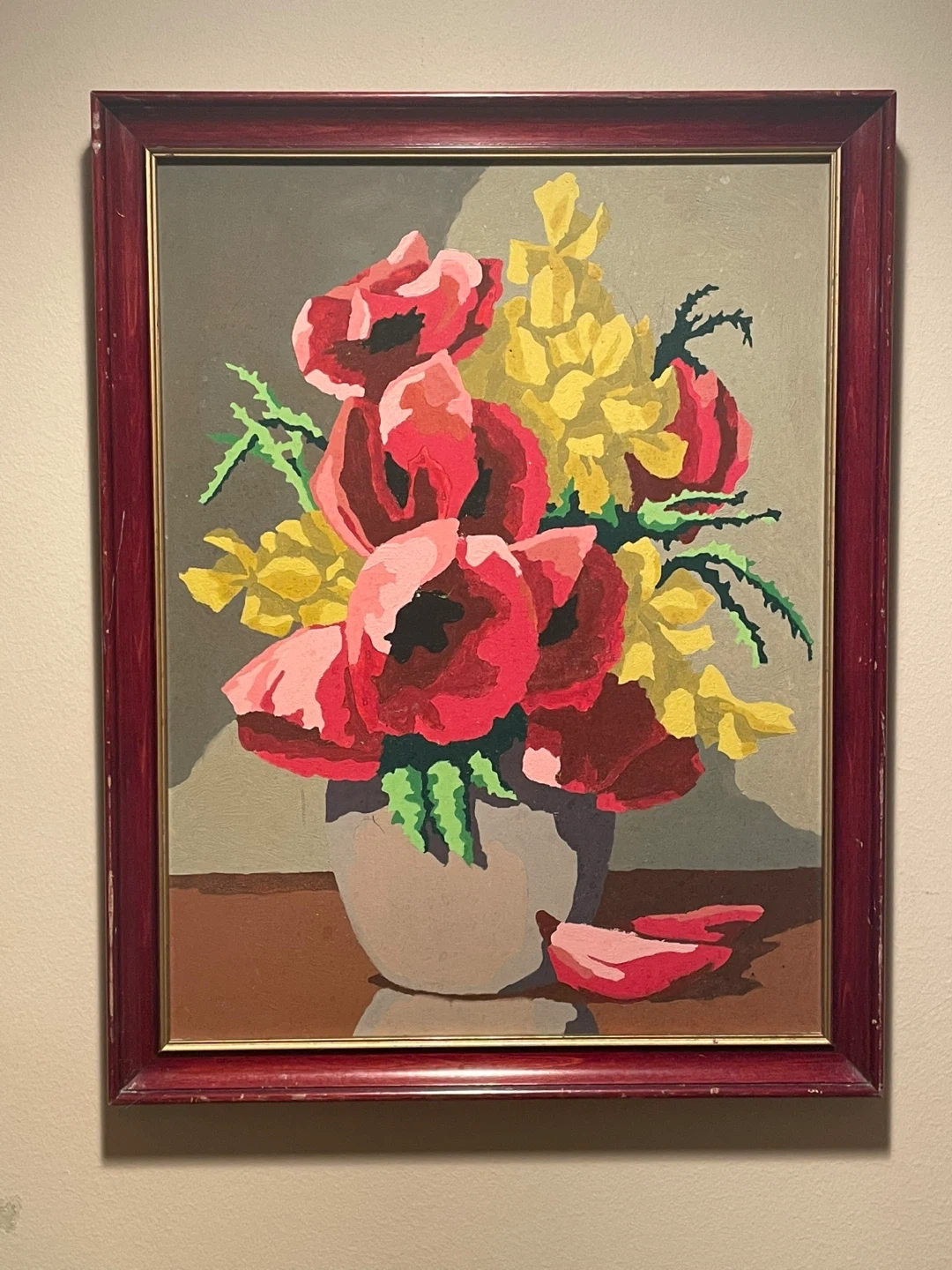 Vintage 1960s framed paint-by-number still life painting featuring red poppies and yellow flowers in a vase.