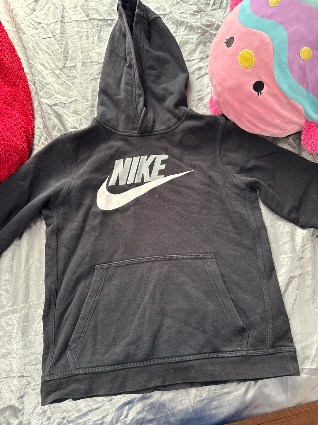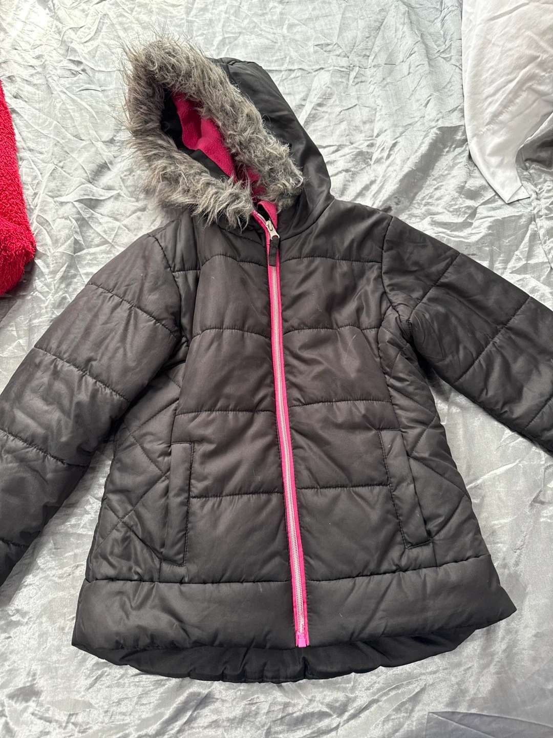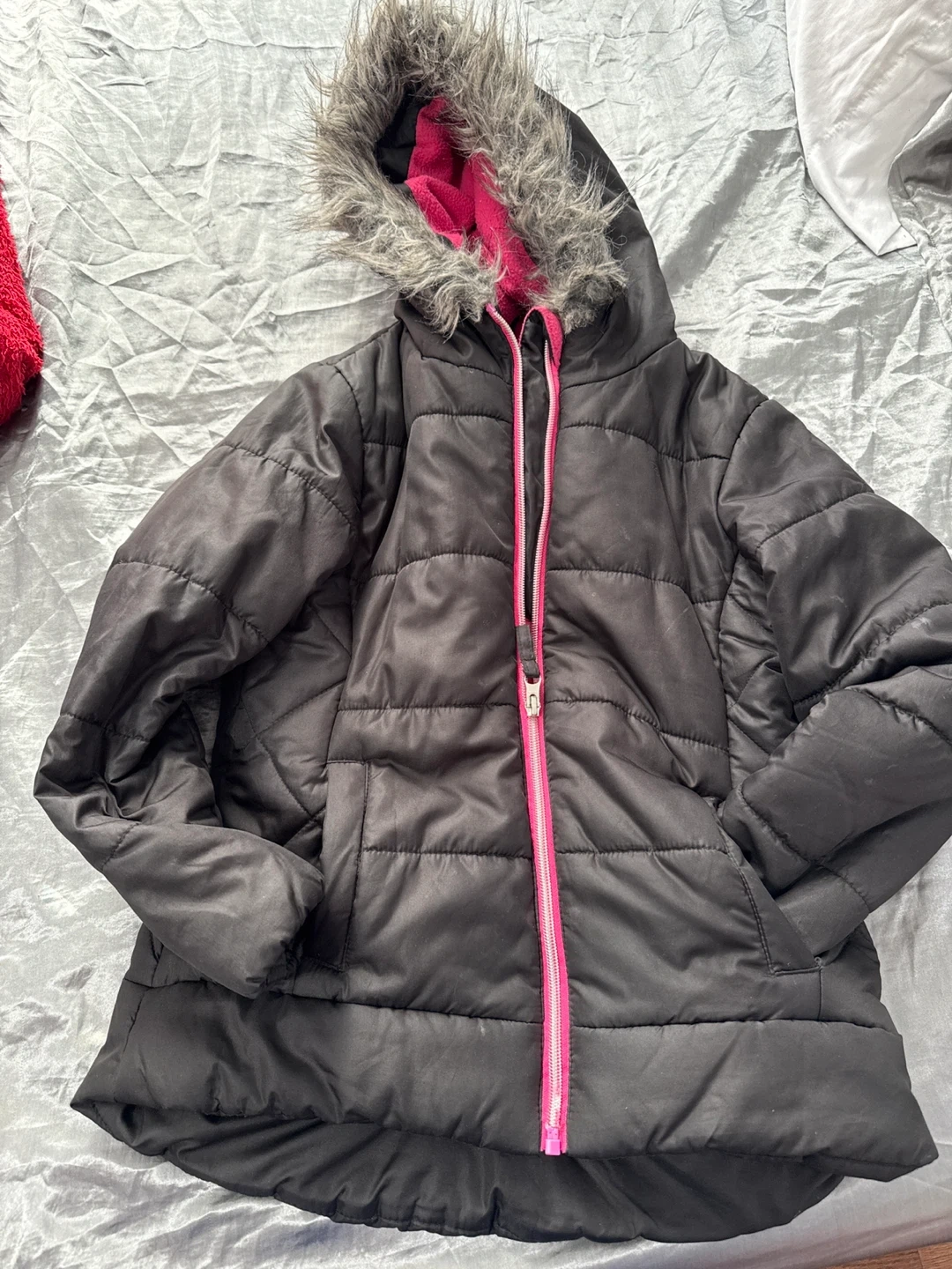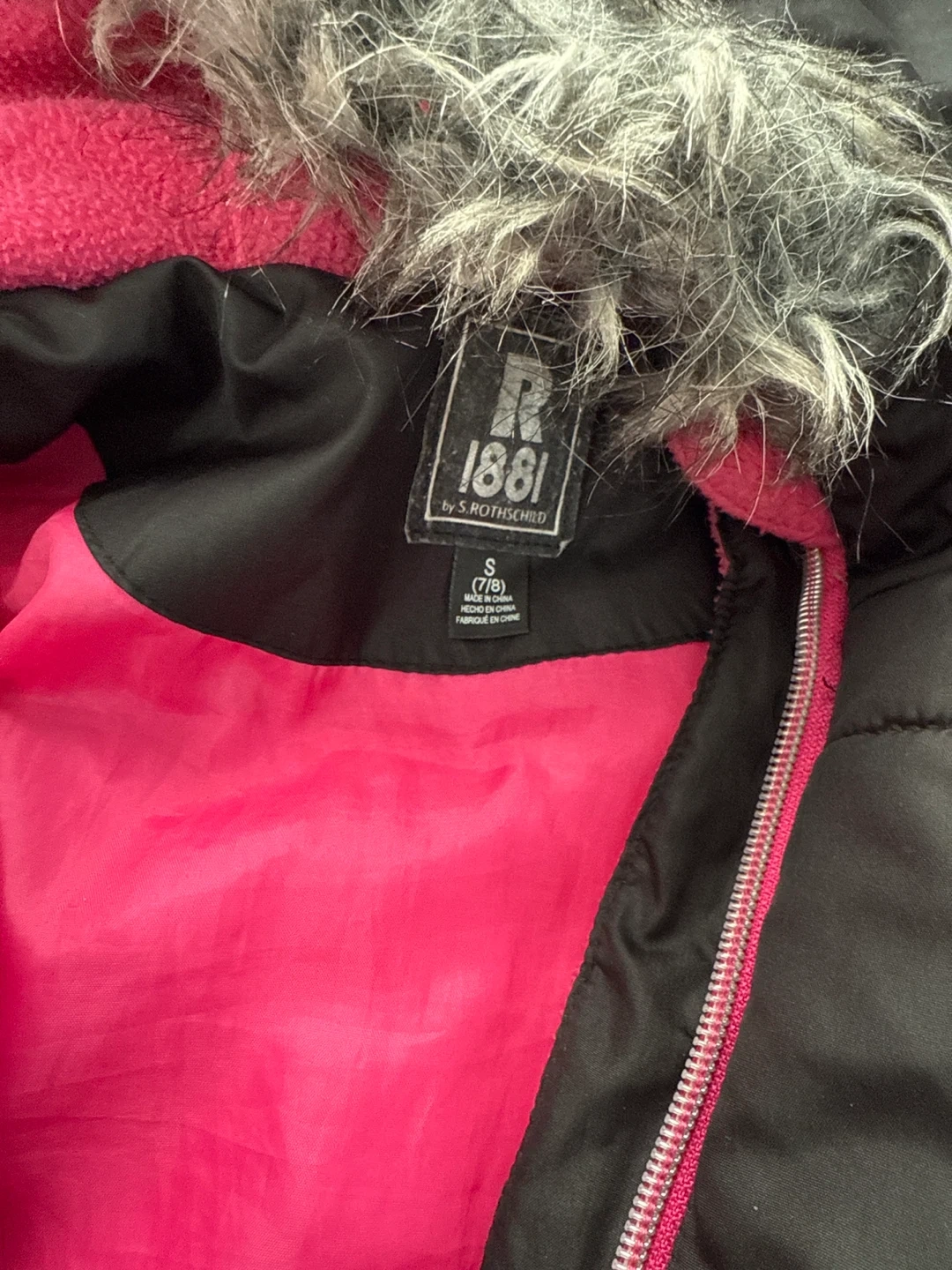 Selling a black puffer jacket from R 1881 by S. Rothschild. It's a size S (7/8) and features a faux fur-trimmed hood and a bright pink lining and zipper. Perfect for keeping warm and stylish!