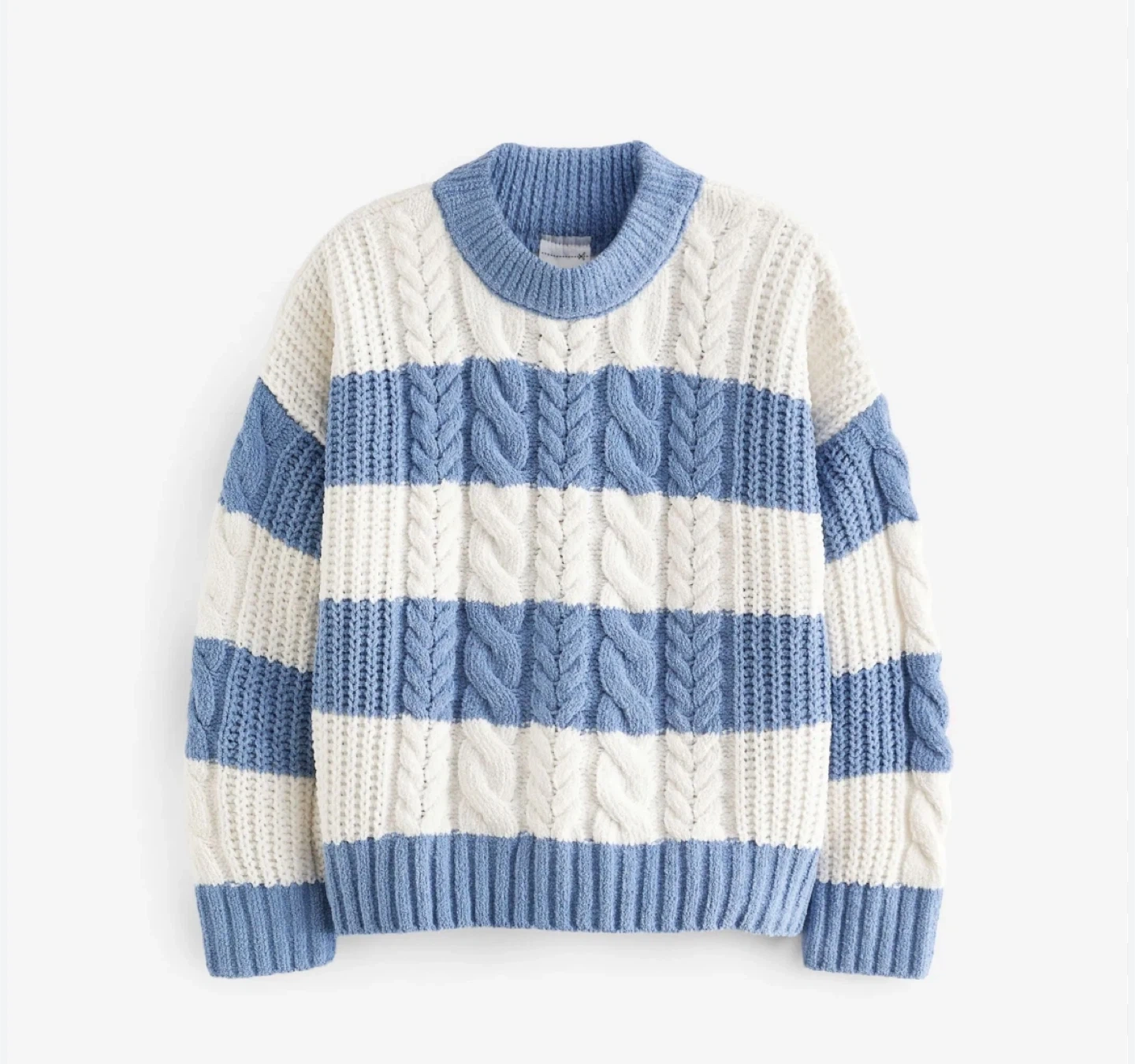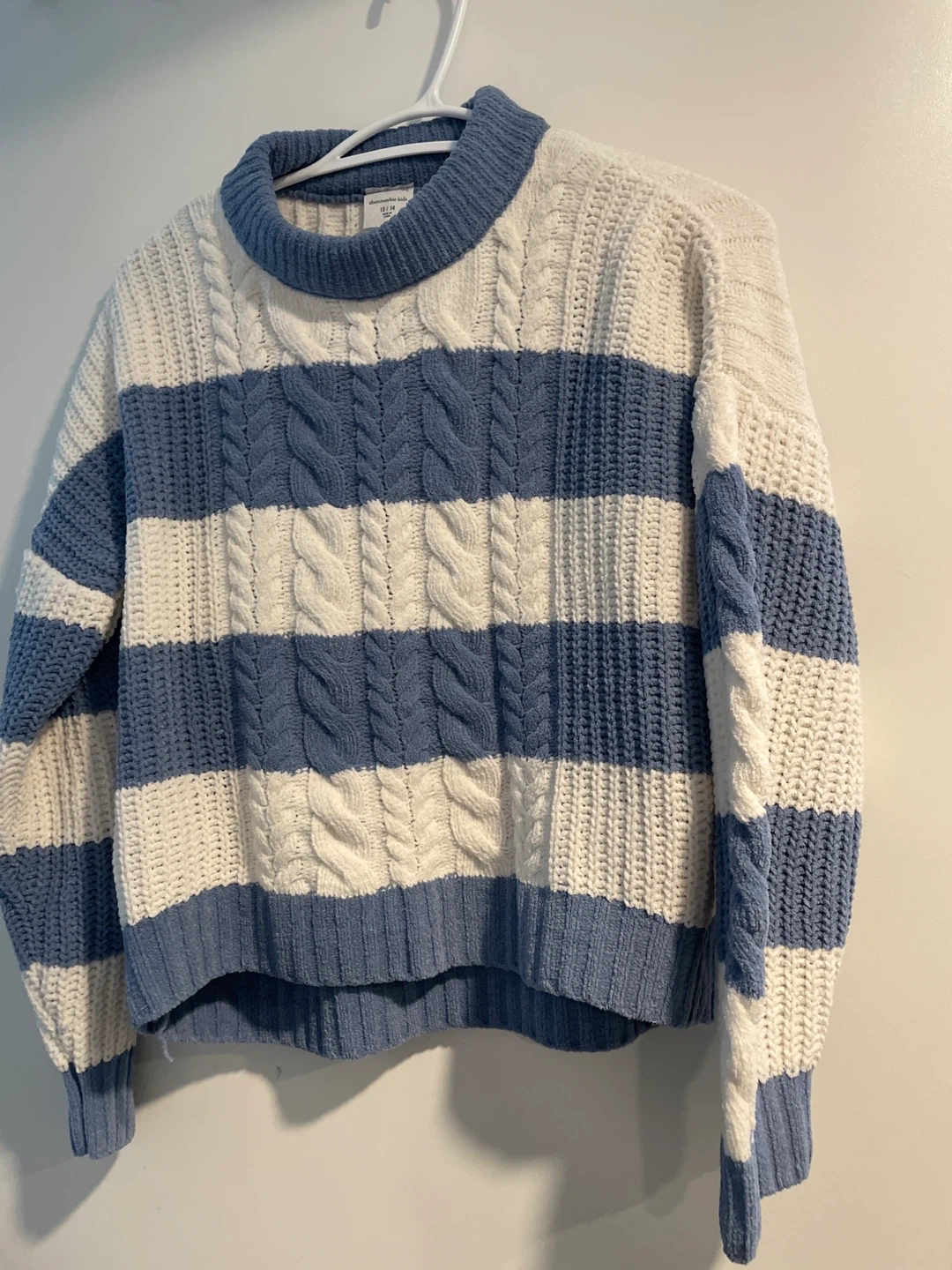 618Selling an Abercrombie Kids sweater in size 13/14. It features a lovely blue and white striped pattern and a cozy, cable-knit texture. Perfect for keeping warm and stylish!