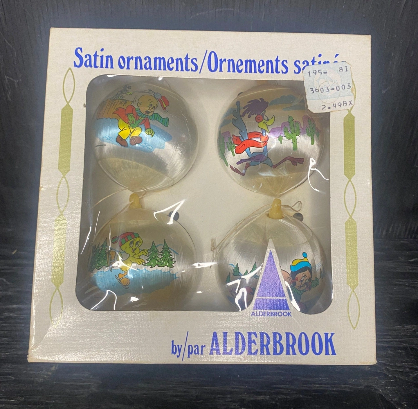 These Vintage Looney Tunes Christmas Ornaments are (we believe) plastic wound with a thread type fabric. The double sided ornament graphics see various Looney Tunes characters and are typically sized ornaments fit for a full sized tree. In their original box, these Looney Tunes ornaments are in excellent condition.