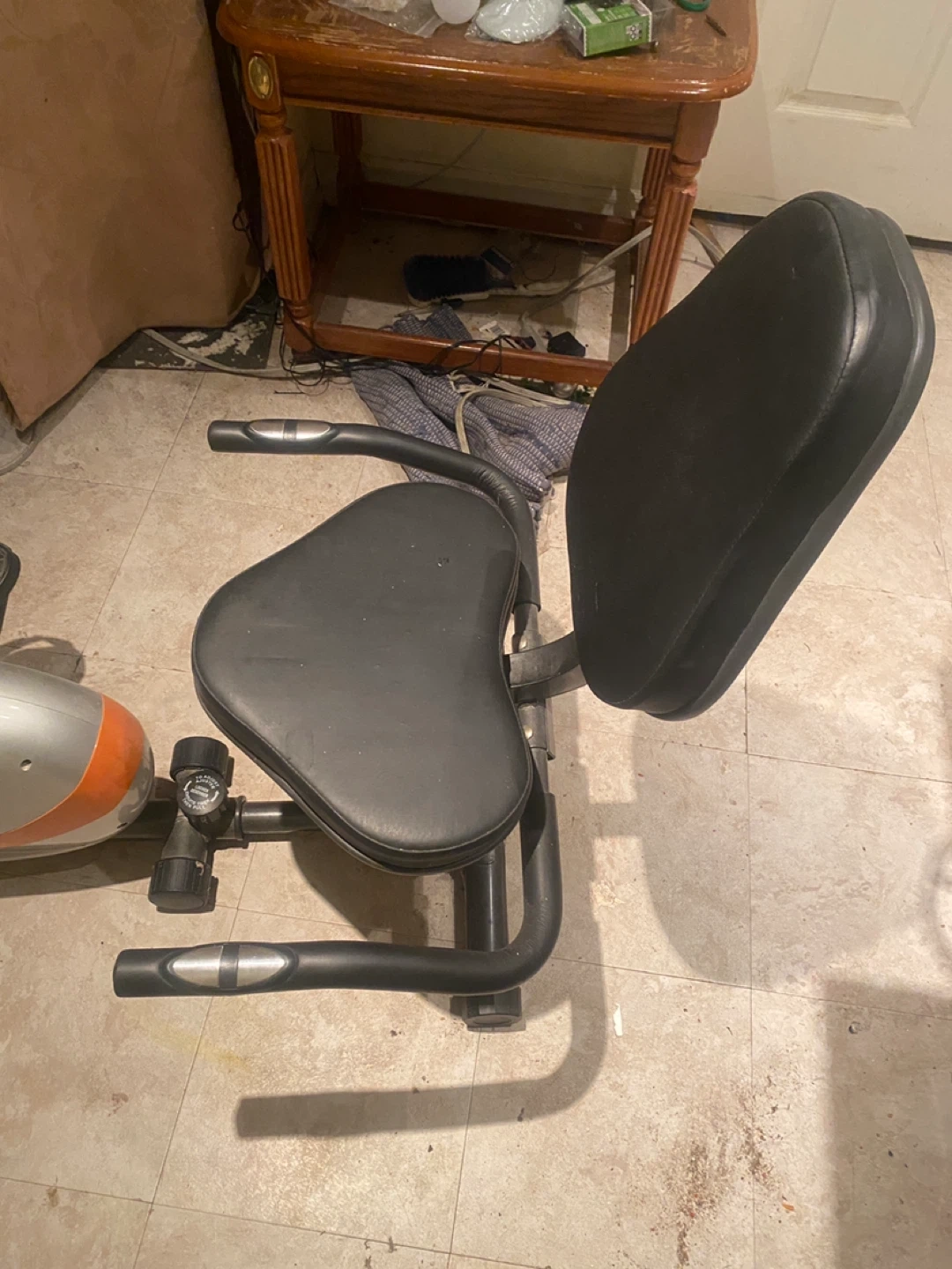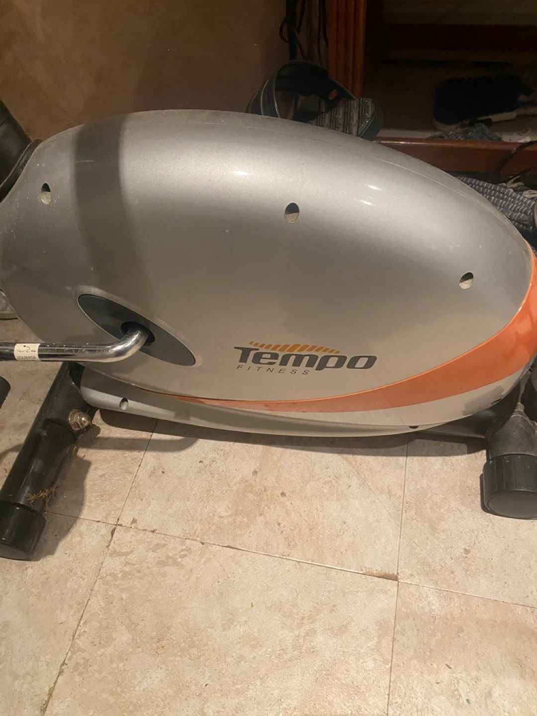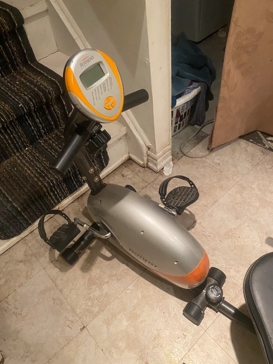 Get fit with this Tempo Fitness exercise bike, perfect for home workouts! This stationary bike is in used condition but is still ready to help you achieve your fitness goals, tracking speed, distance and calories burned.