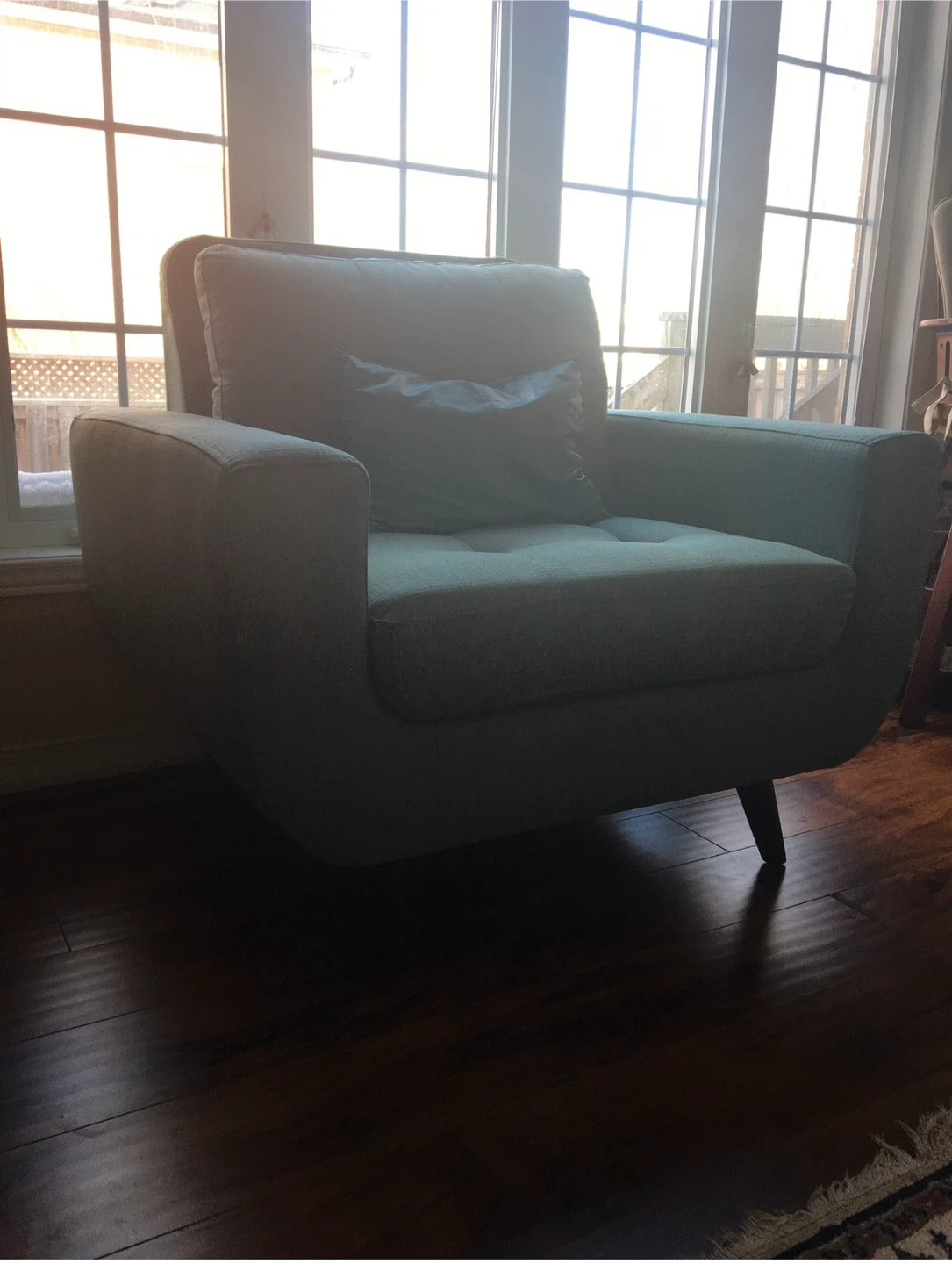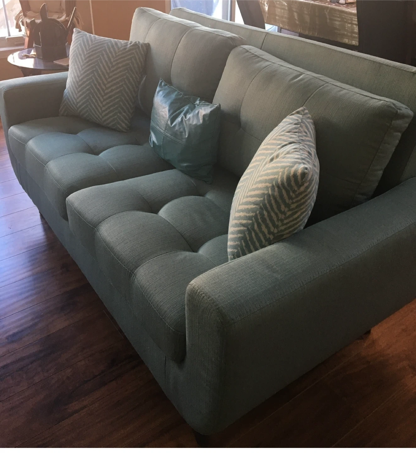 Selling a comfy teal-coloured sofa and armchair set! They're in great shape and would look lovely in any living room or den. Perfect for lounging and relaxing after a long day. Cousins are not included !