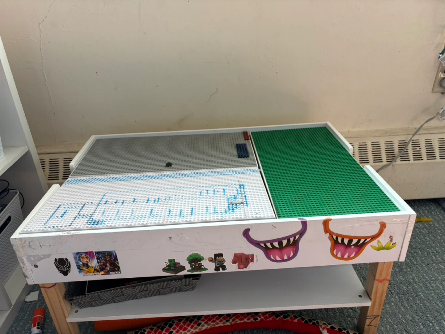 Selling a Lego compatible activity table. It has a white frame with grey and green Lego compatible surfaces. There are some stickers on the sides but no damage. Only cosmetic issues that can be removed with goo gone