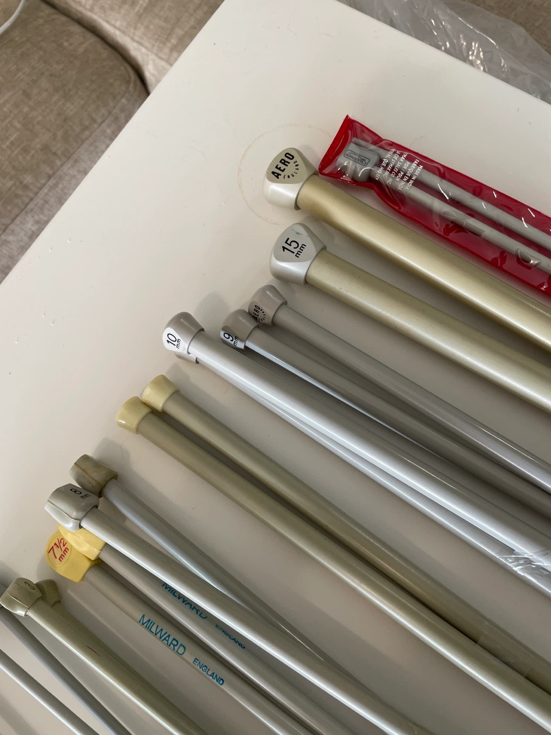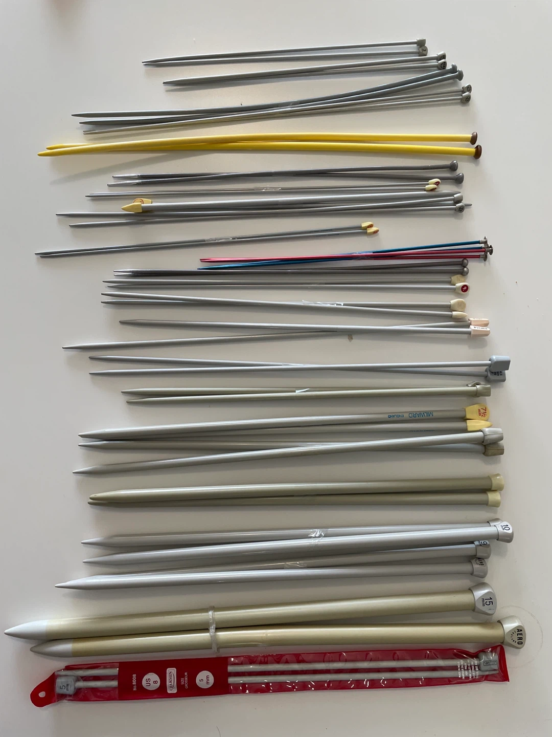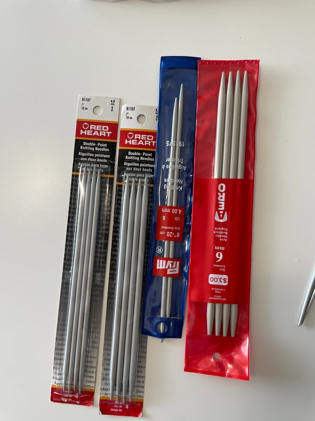 Selling a variety of knitting needles, including brands like Red Heart and Aero! There are several sizes available, perfect for all your knitting projects. Get them all in one go.