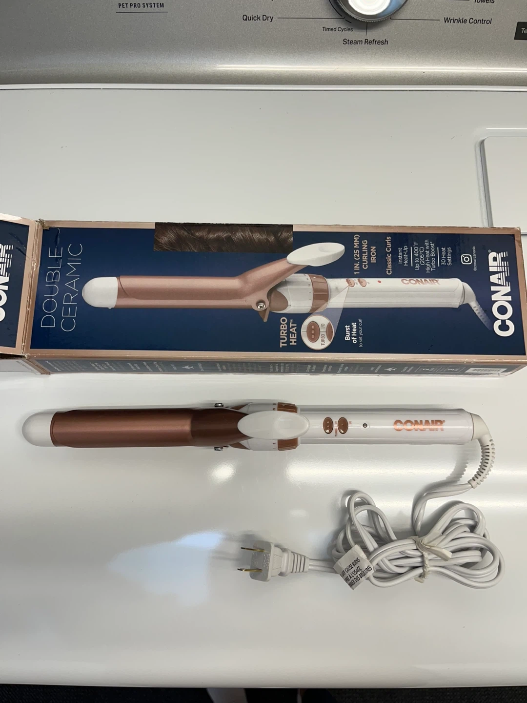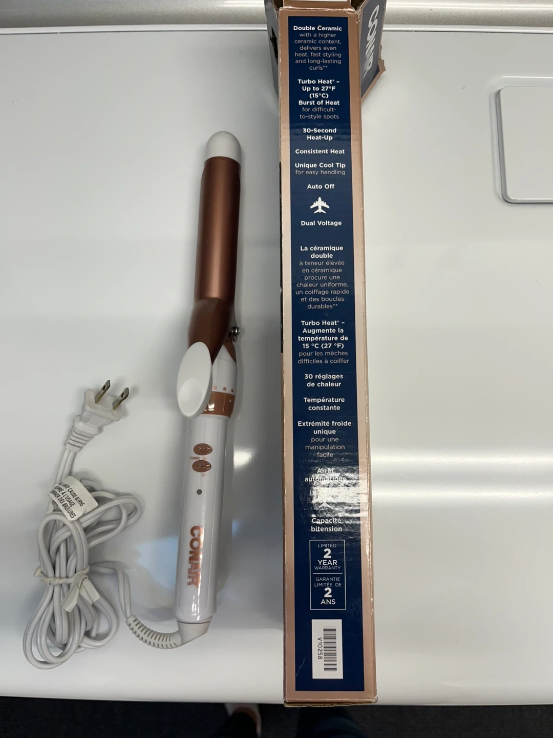 Selling a Conair Double Ceramic 1-inch curling iron. It features a higher ceramic content for even heat, fast styling, and long-lasting curls. It also has turbo heat for instant results and 30-second heat-up. The unique cool tip makes it easy to handle, and it has an auto-off function. Dual voltage, too! Comes with a 2-year limited warranty and the original box