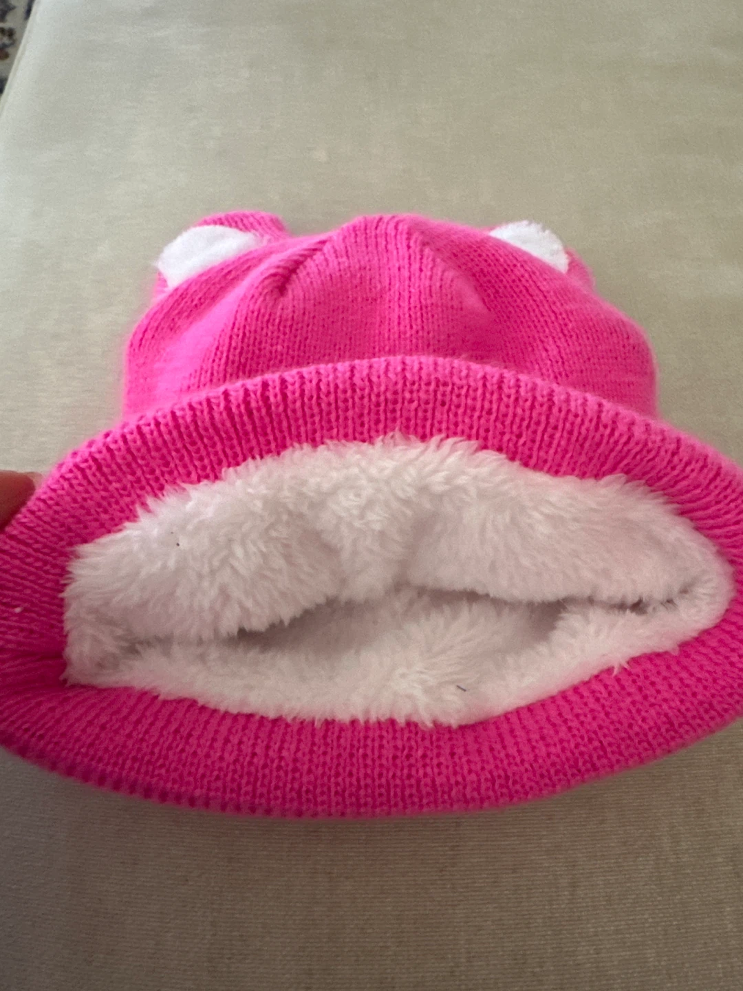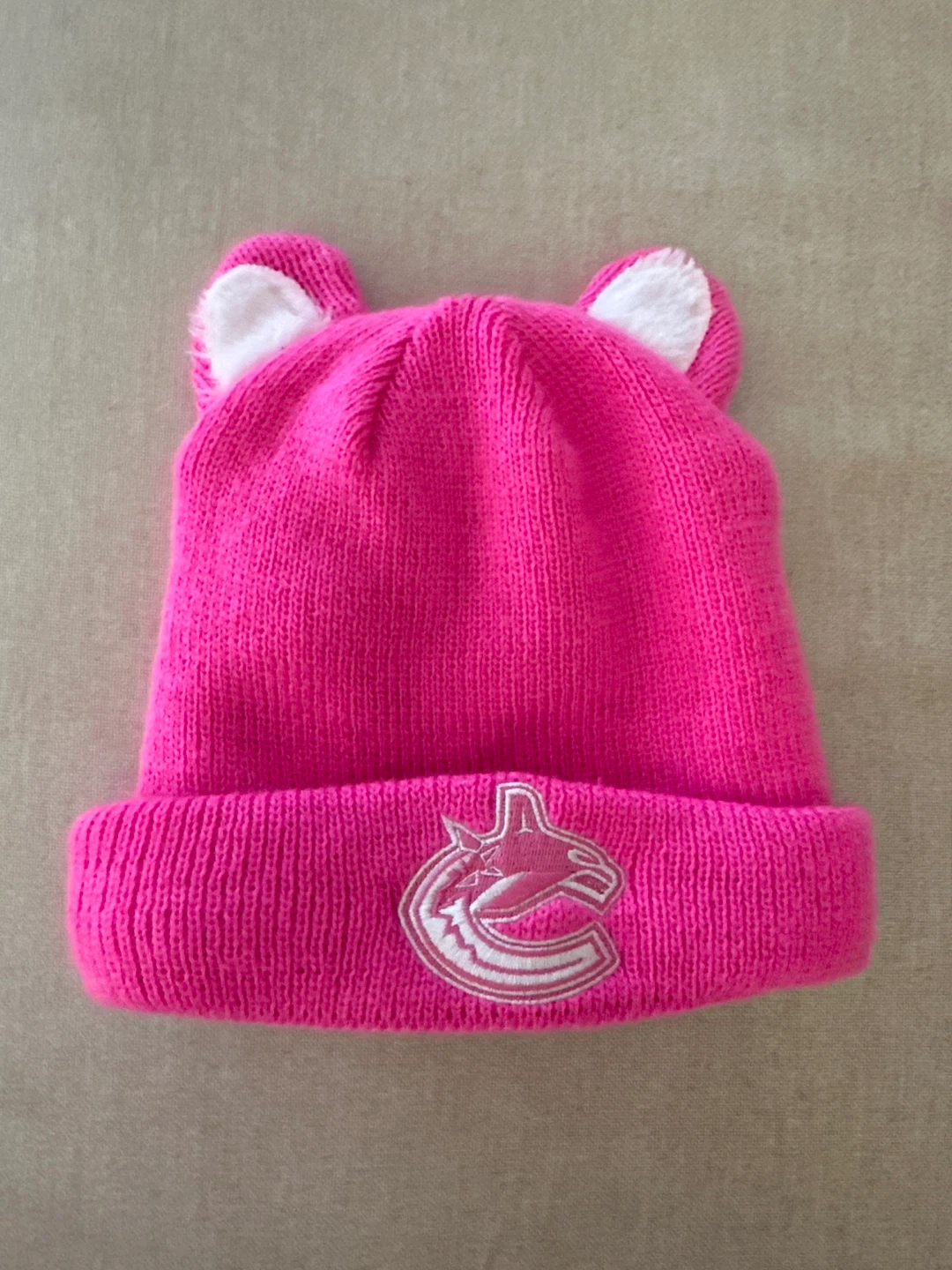 Check out this adorable New Era toddler beanie! It's bright pink with the Vancouver Canucks logo and cute little ears. The inside is lined with soft, white fleece to keep your little one warm and cozy during those chilly days at the rink or just out and about