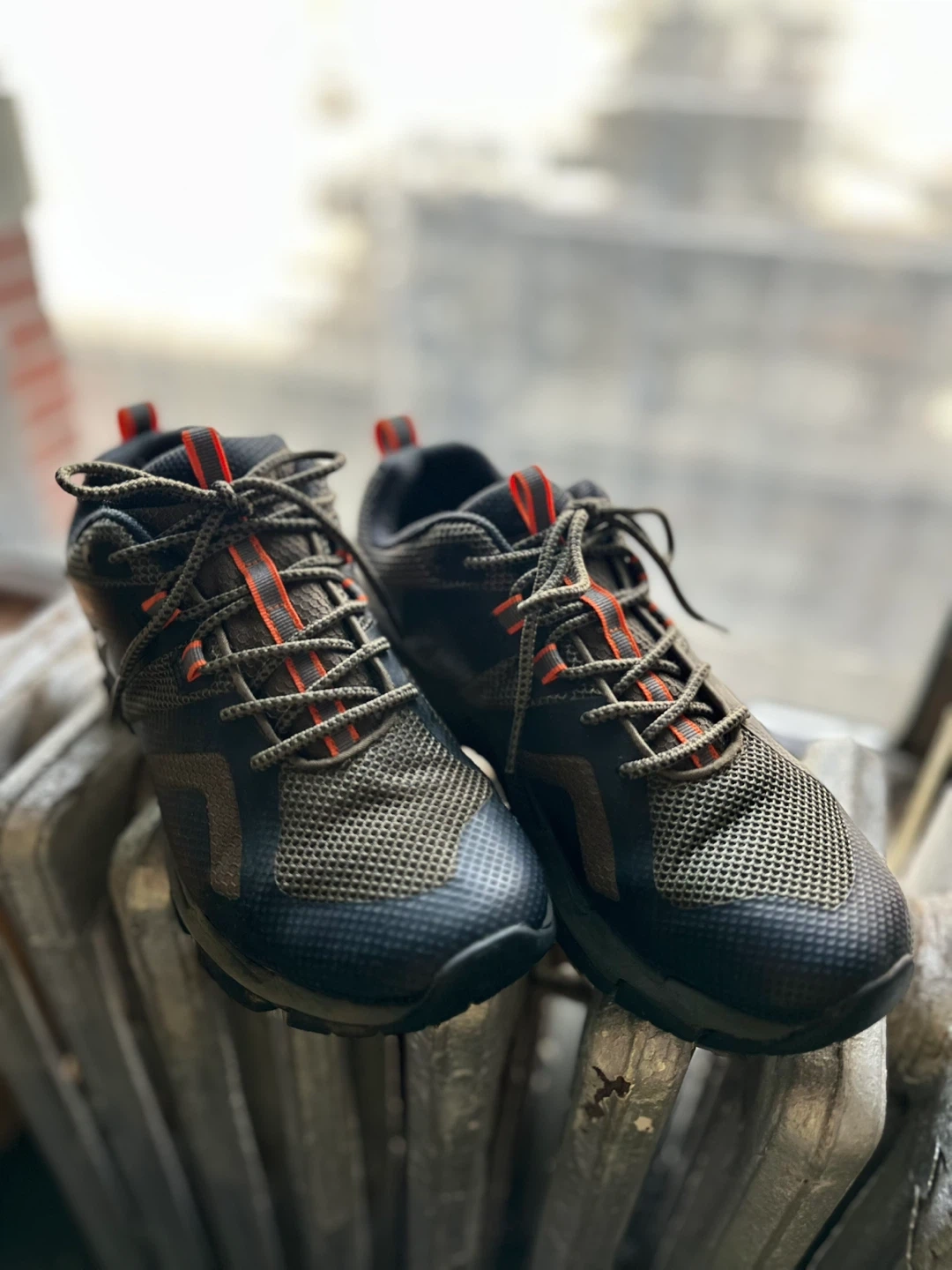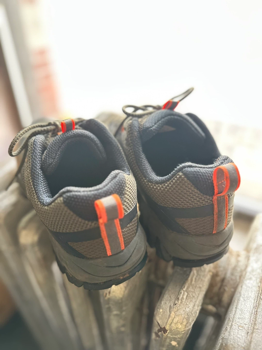 Selling a pair of Merrell trail running shoes. They show some signs of wear, particularly on the soles, but still have plenty of life left in them! Perfect for hiking or trail running. They are a dark color with orange accents.