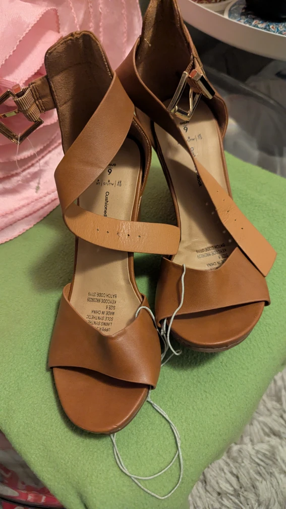 These heels are a stylish addition to any wardrobe! They are a size 6 and feature a cushioned insole for extra comfort. The color is a beautiful brown that goes well with many outfits.