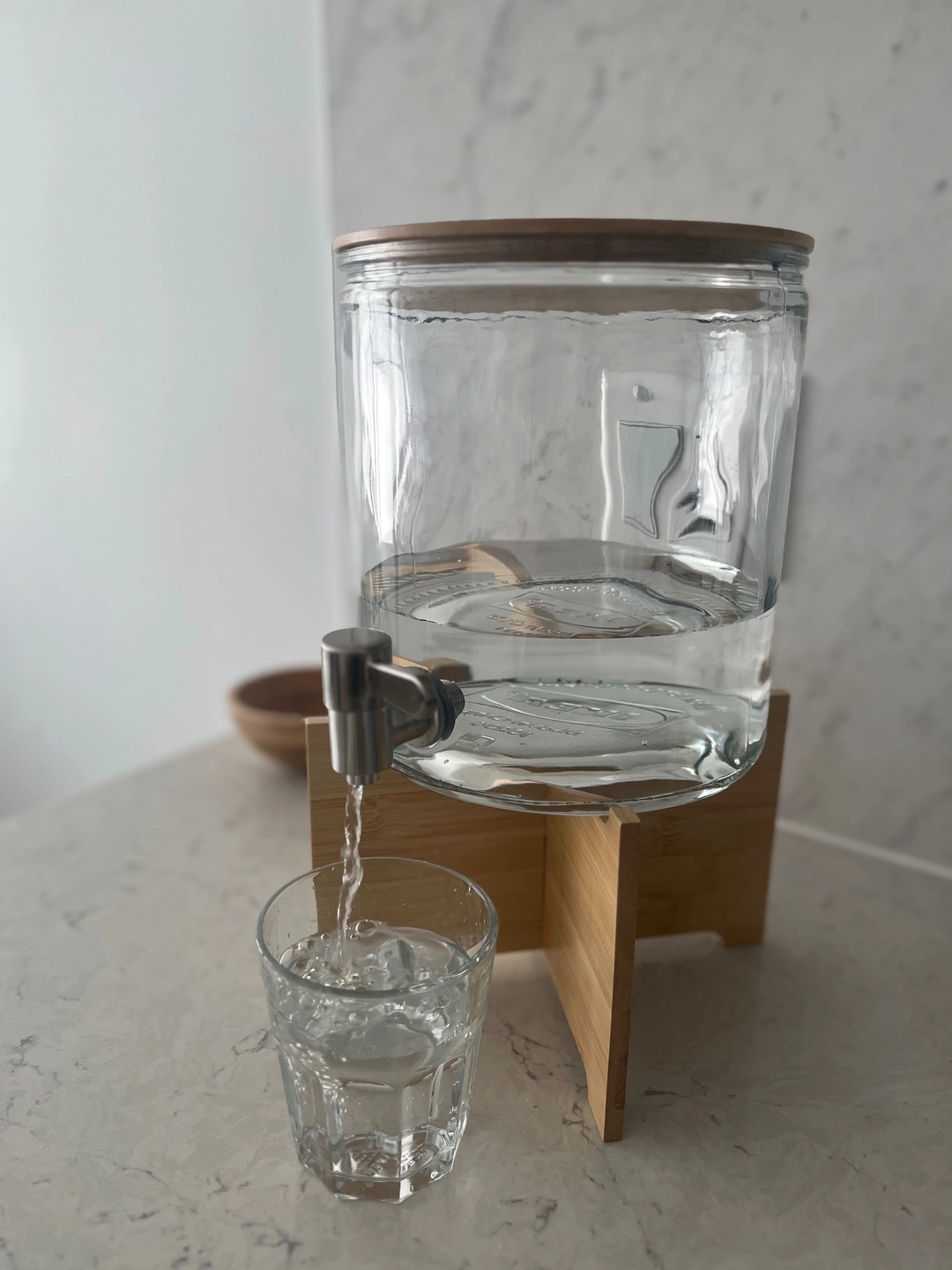 Moving sale! Beverage dispenser, bamboo/clear glass + base
