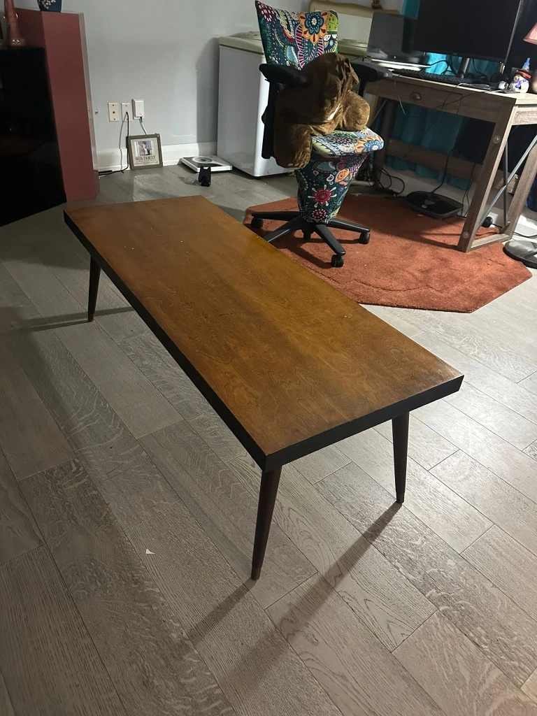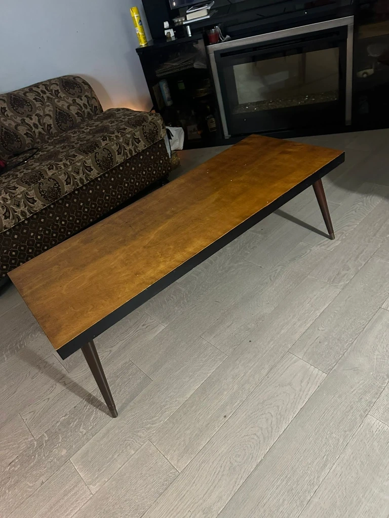 Selling a wood coffee table. It's about 1.23 meters long and 40 cm high, perfect for a living room!