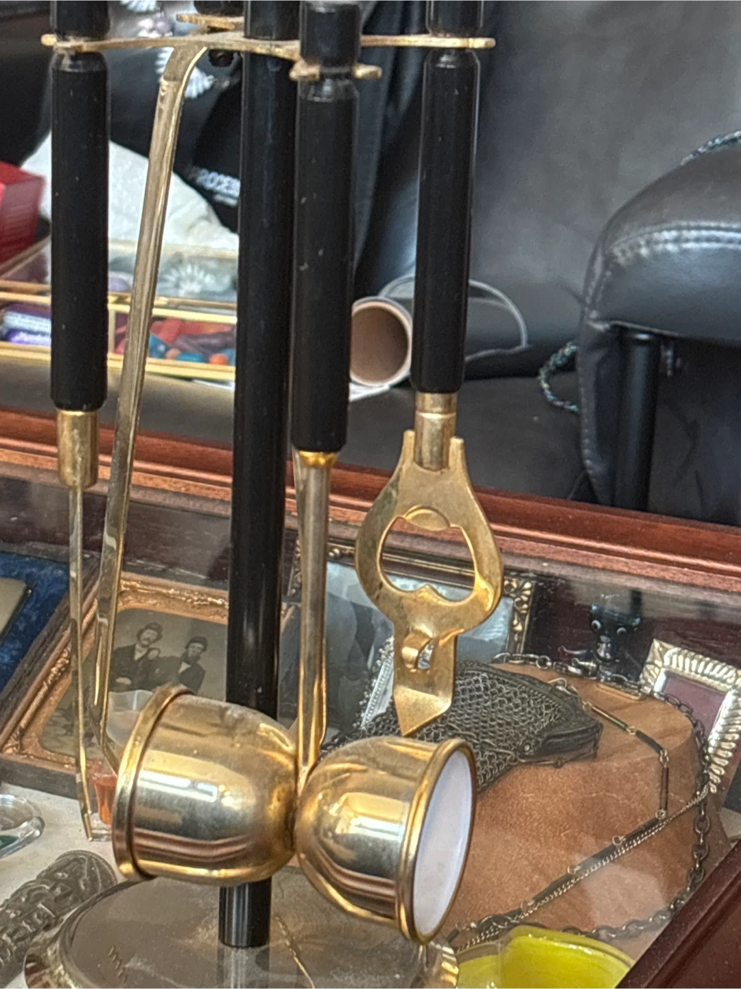 Here's a vintage brass barkeep tool set! It has a classic look with black handles and gold-tone metal. It's in excellent condition and would look great for your Christmas party bar area setup