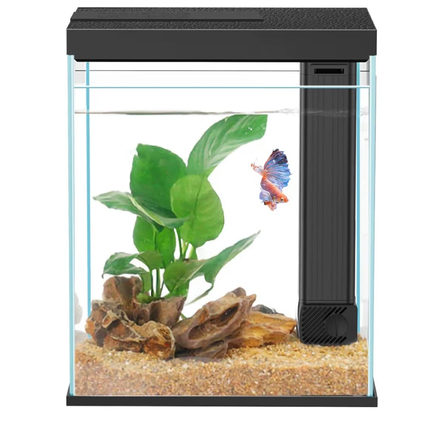 I'm selling a small fish tank that comes with a filter and adjustable LED light! The light has 8 gears of intensity and can be set to white, blue, red, green/blue, red and green. The tank's dimensions are 11 inches x 8.27 inches x 5.9 inches. The water pump is 3.5W