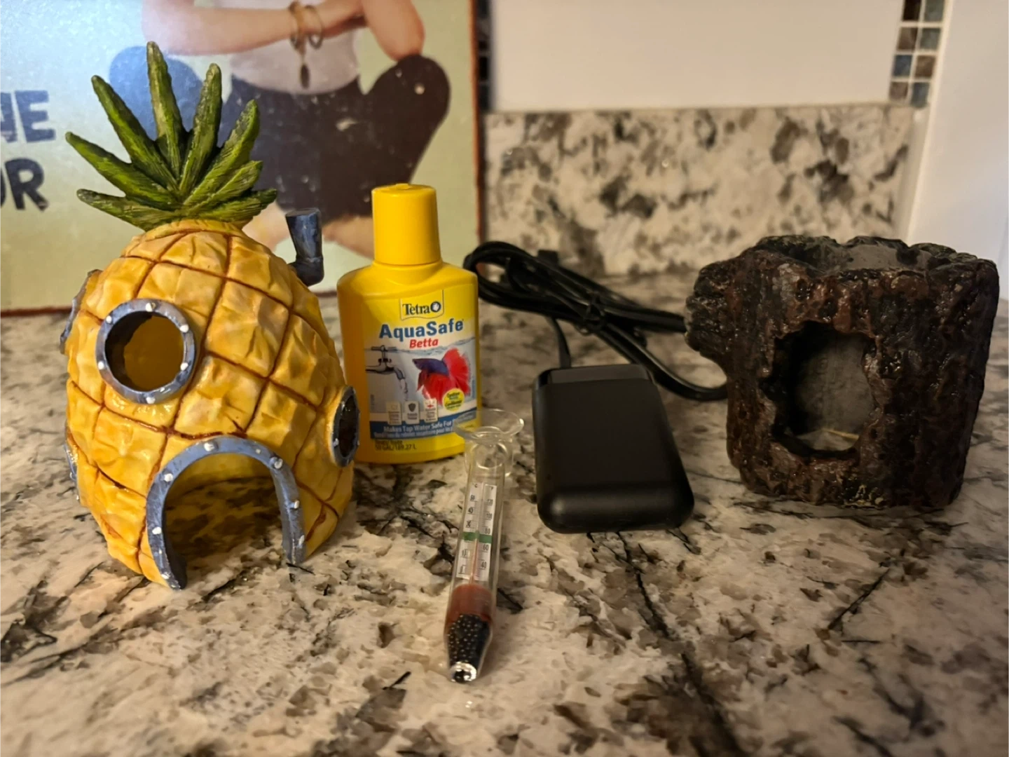 Also included: fish net, sponge bob house decoration, floating log, plug in water heater, glass temp gauge and I have some water conditioner left.