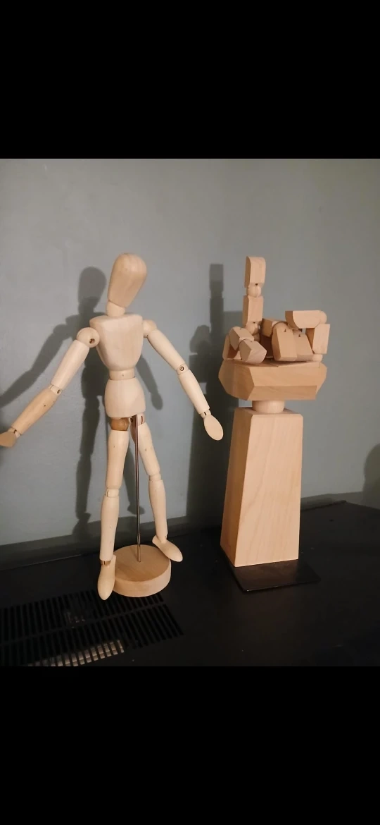 Selling a wooden art mannequin and a wooden hand sculpture. Both are in great condition and perfect for artists or anyone looking for unique decor!