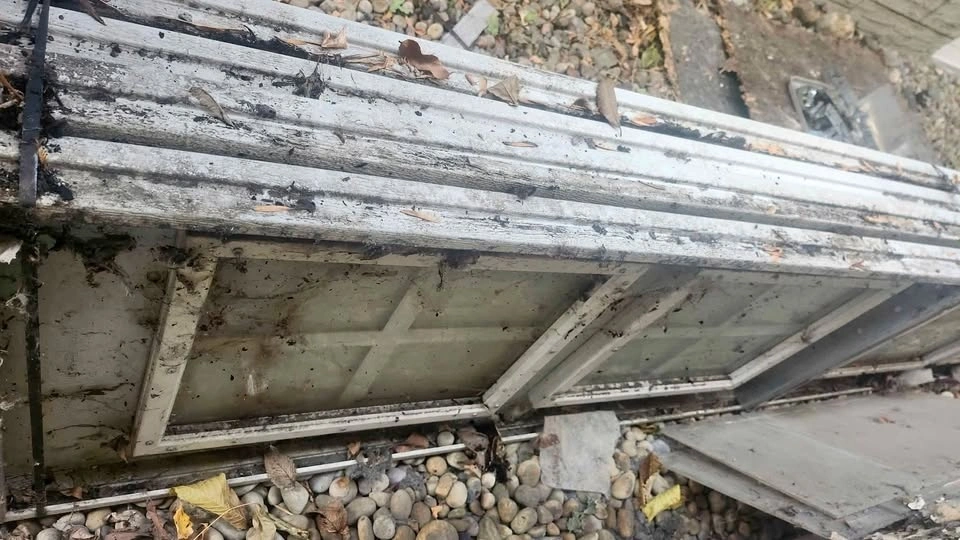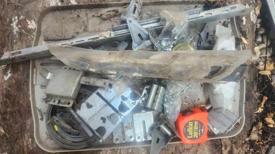 comes all the hardware and instructions though it's weathered. bought it a year ago in the spring and decided not to install it has been sitting outside since, just needs a rinse off / pressure wash...