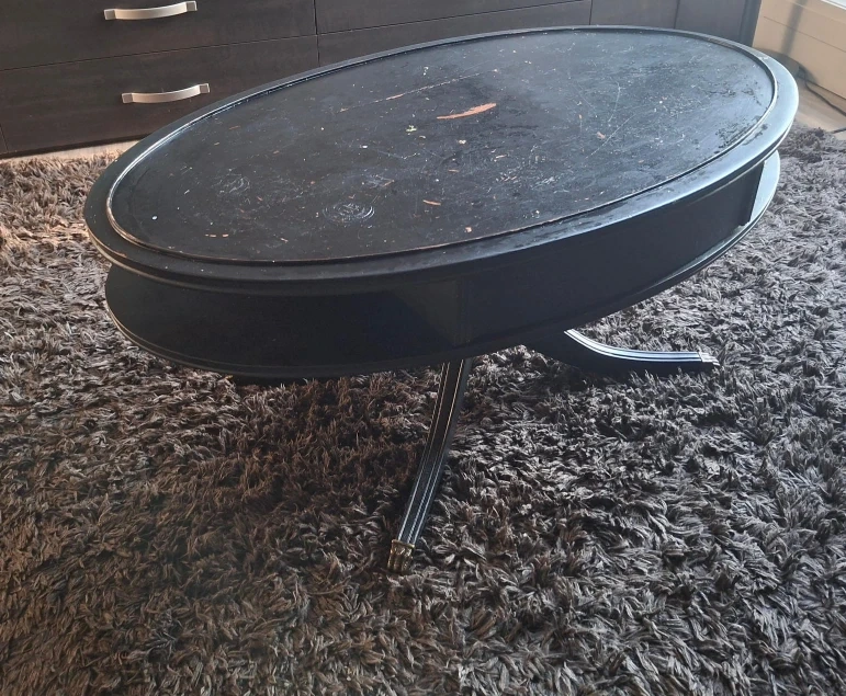 Selling a black oval coffee table! It has a unique design with a lower shelf for storage. The table shows some signs of wear, but it's still a functional and stylish piece for any living room or den